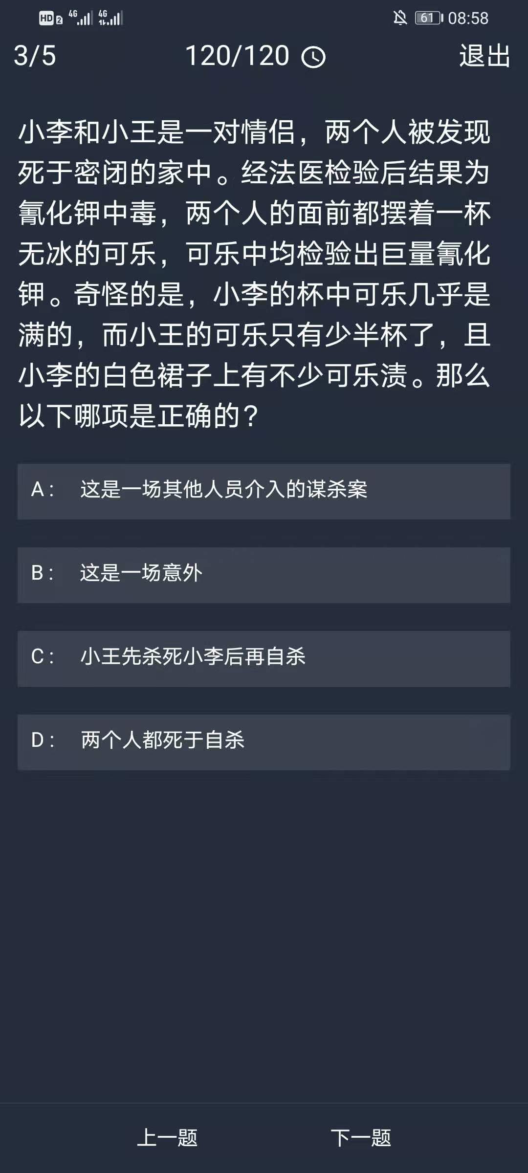 3、小李和小王是一对情侣,两个人被发现死于密闭的家中。经法医检验后结果为氰化钾中毒,两个人的面前都摆着一杯无冰的可乐,可乐中均检验出巨量氰化钾。奇怪的是,小李的杯中可乐几乎是满的,而小王的可乐只有少半杯了,且小李的白色裙子上有不少可乐渍。那么以下哪项是正确的?
