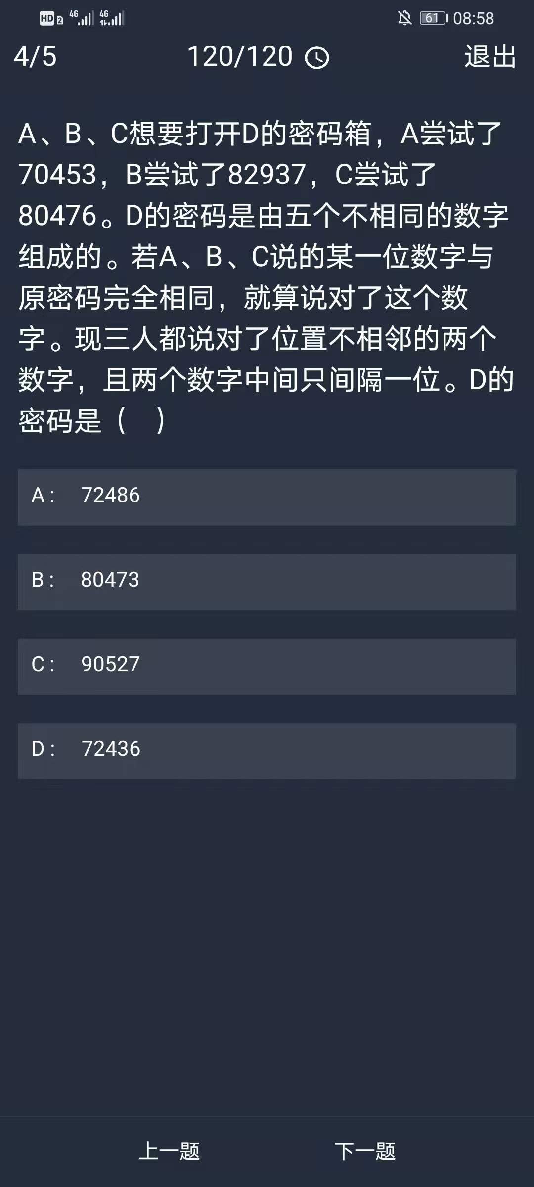 4、A、B、C想要打开D的密码箱,A尝试了70453,B尝试了82937,C尝试了80476。D的密码是由五个不相同的数字组成的。若A、B、C说的某一位数字与原密码完全相同,就算说对了这个数字。现三人都说对了位置不相邻的两个数字,且两个数字中间只间隔一位。D的密码是()