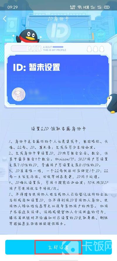 5、进入QID身份卡页面后,点击下方的【立即设置】选项,进入开通领取ID身份卡(注意目前无法关闭QID);
