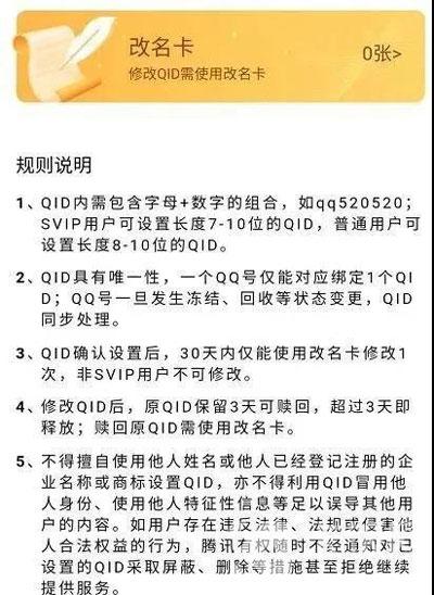 4、QID确认设置后,可以使用改名卡修改,但是修改后30天内,仅能使用一次,并且只有SVIP用户可修改;