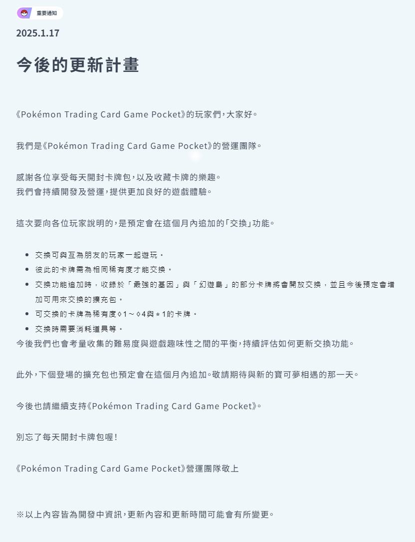 手游《宝可梦TCG Pocket》官方发布了更新公告,宣布将在本月追加交换功能,玩家之间终于可以换卡了!