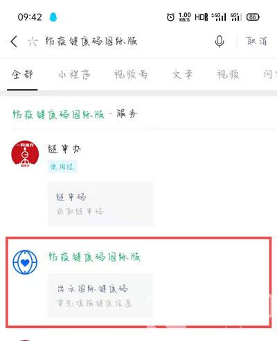 6、以微信为例,打开微信,搜索【防疫健康码国际版】,然后点击搜索结果中的【防疫健康码国际版】进入;
