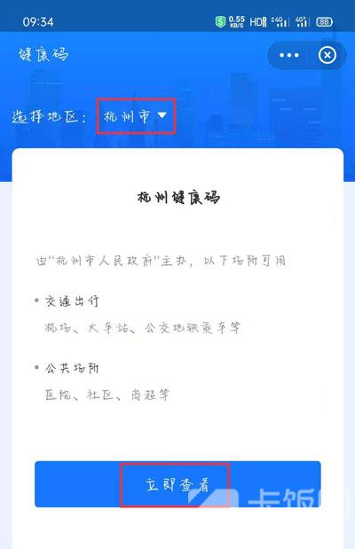 3、因为目前国际版健康码只有杭州有,需要切换到【浙江】-【杭州】,点击【立即查看】;