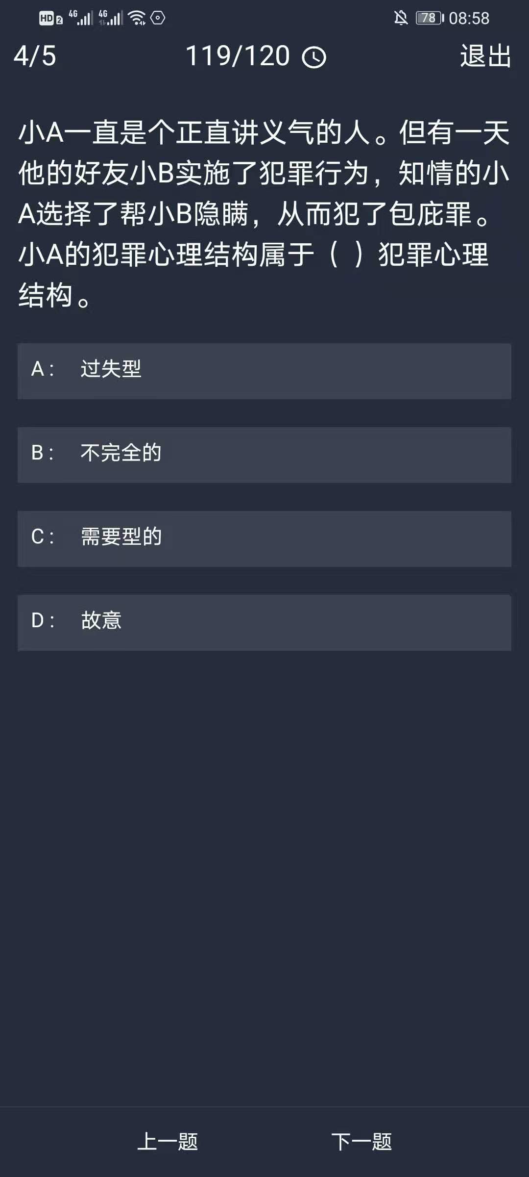 4、小A一直是个正直讲义气的人。但有一天他的好友小B实施了犯罪行为,知情的小A选择了帮小B隐瞒,从而犯了包庇罪。小A的犯罪心理结构属于()犯罪心理结构。