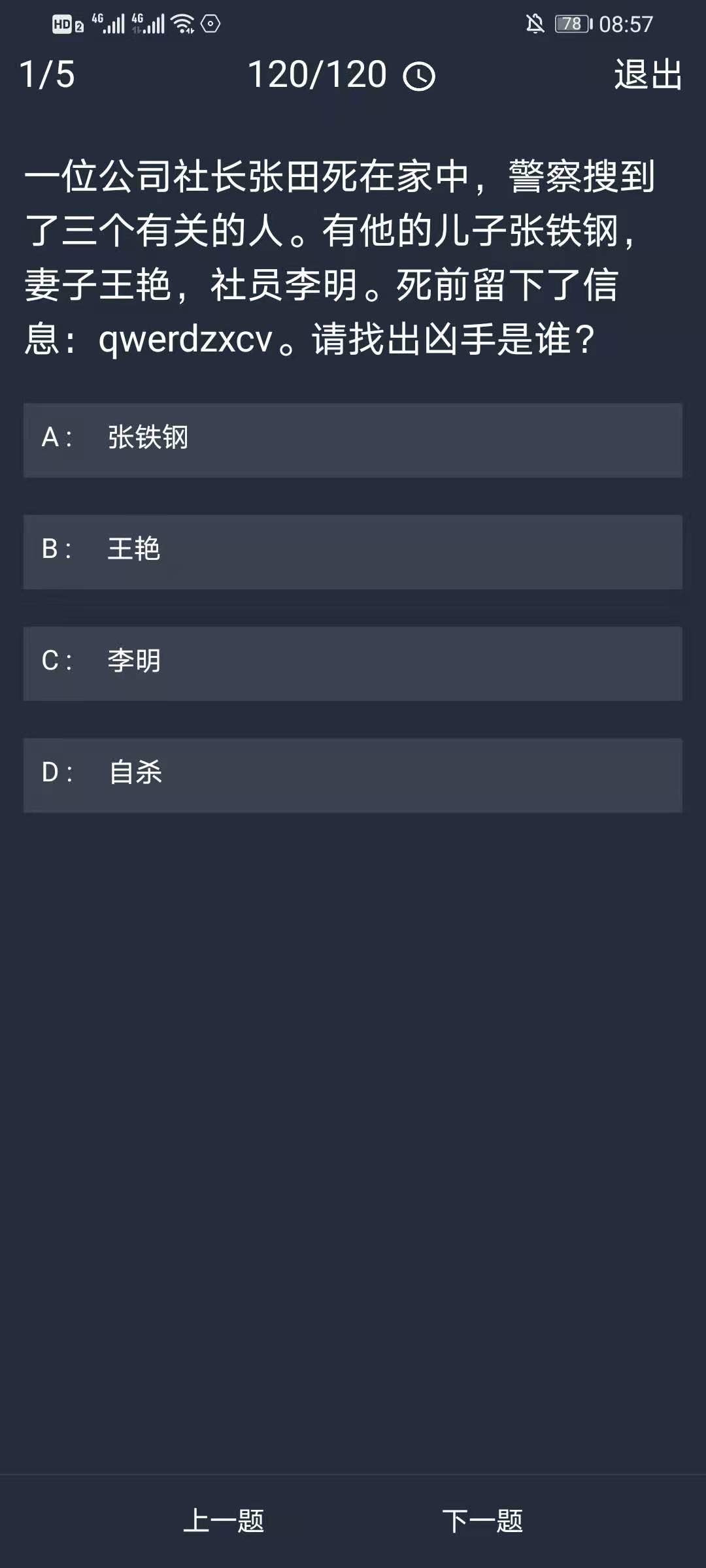 1、一位公司社长张田死在家中,警察搜到了三个有关的人。有他的儿子张铁钢,妻子王艳,社员李明。死前留下了信息:qwerdzxcv。请找出凶手是谁?