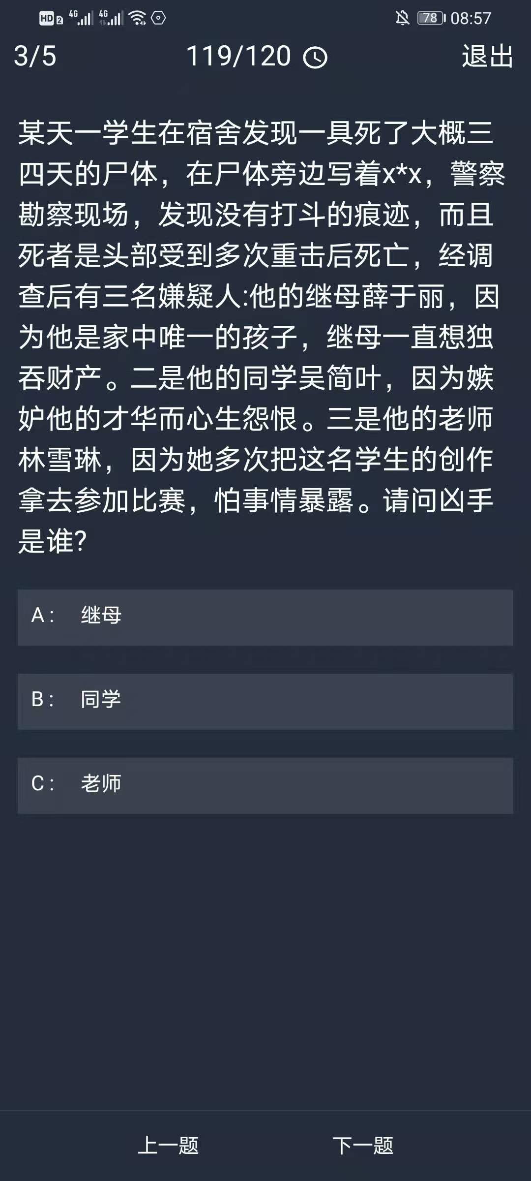 3、某天一学生在宿舍发现一具死了大概三四天的尸体,在尸体旁边写着x*x,警察勘察现场,发现没有打斗的痕迹,而且死者是头部受到多次重击后死亡,经调查后有三名嫌疑人:他的继母薛于丽,因为他是家中唯一的孩子,继母一直想独吞财产。二是他的同学吴简叶,因为嫉妒他的才华而心生怨恨。三是他的老师林雪琳,因为她多次把这名学生的创作拿去参加比赛,怕事情暴露。请问凶手是谁?