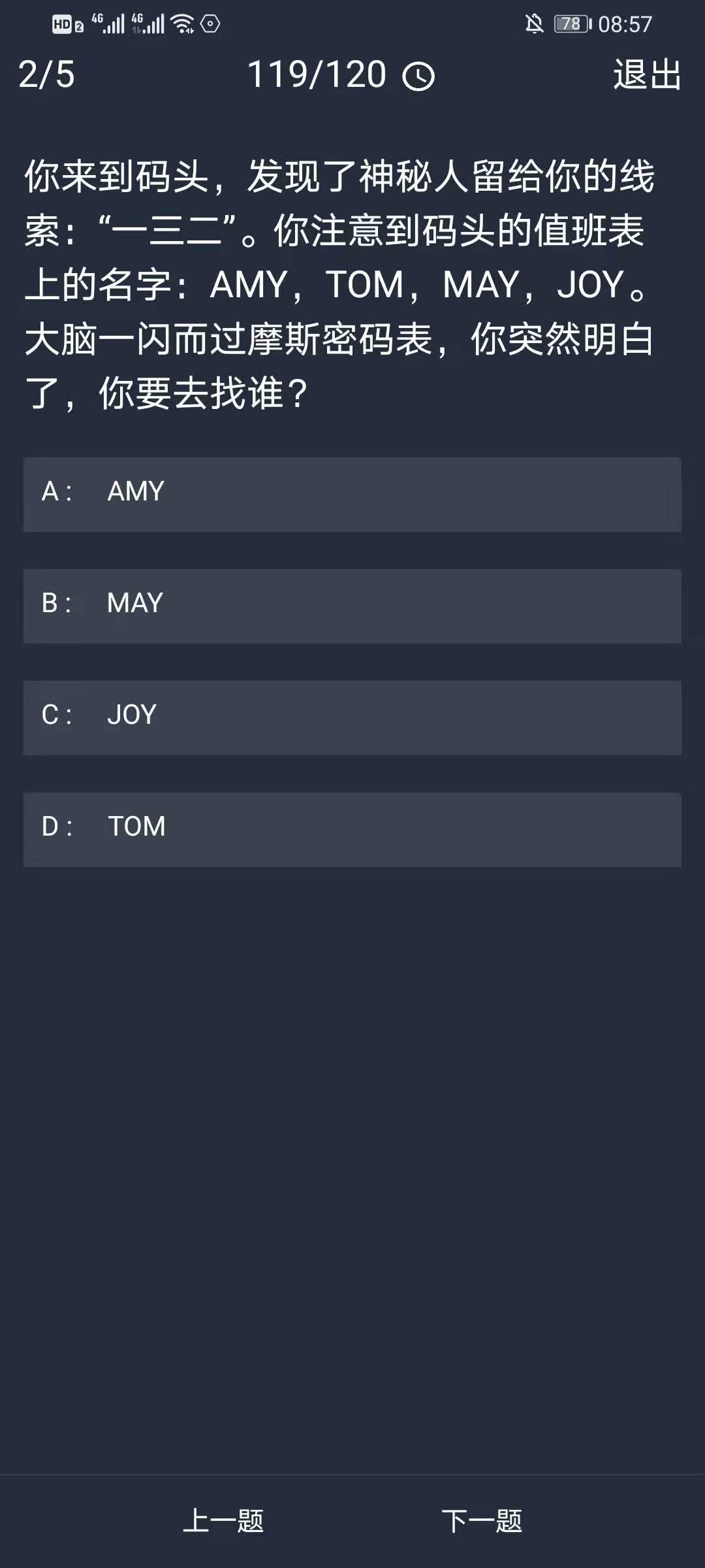2、你来到码头,发现了神秘人留给你的线索:“一三二”。你注意到码头的值班表上的名字:AMY,TOM,MAY,JOY。大脑一闪而过摩斯密码表,你突然明白了,你要去找谁?