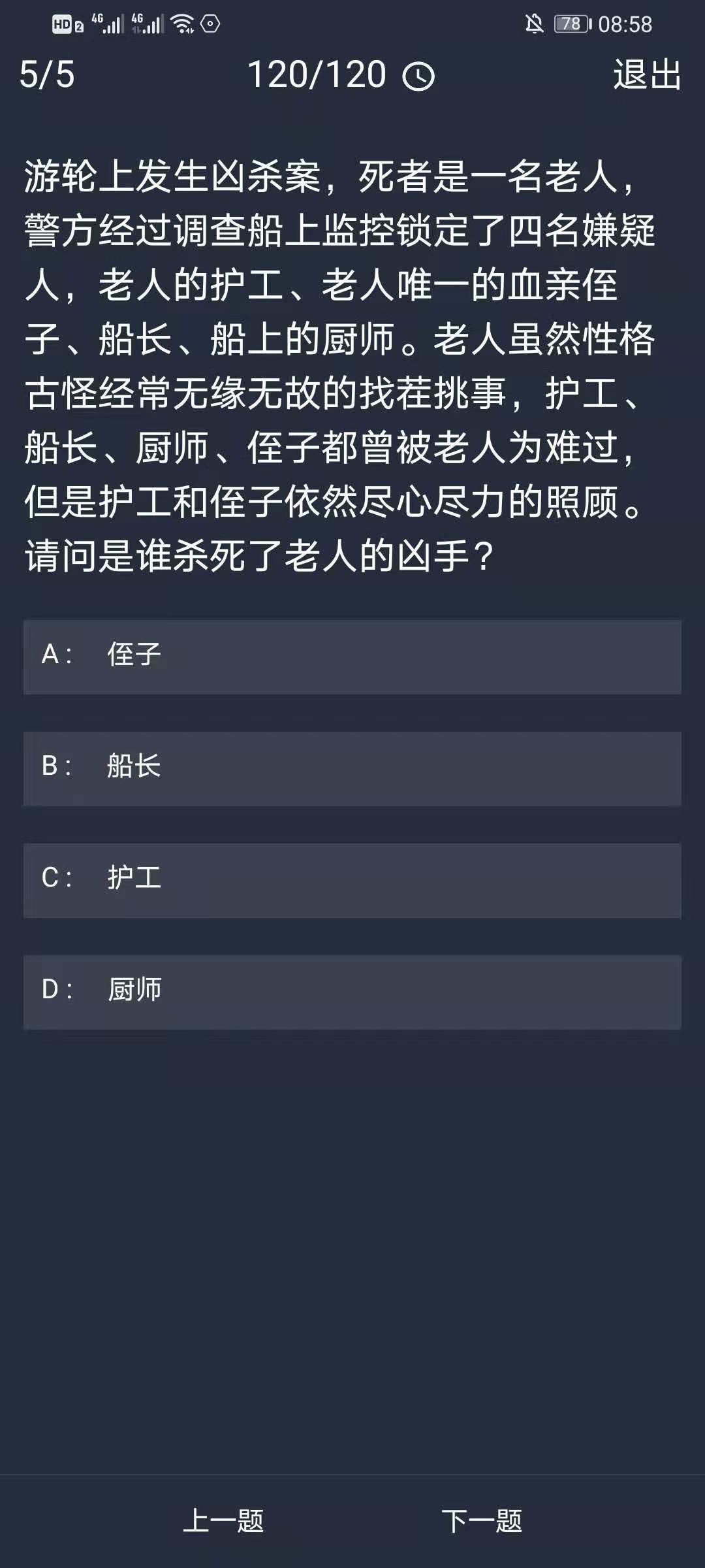 5、游轮上发生凶杀案,死者是一名老人,警方经过调查船上监控锁定了四名嫌疑人,老人的护工、老人唯一的血亲侄子、船长、船上的厨师。老人虽然性格古怪经常无缘无故的找茬挑事,护工、船长、厨师、侄子都曾被老人为难过,但是护工和侄子依然尽心尽力的照顾。请问是谁杀死了老人的凶手?
