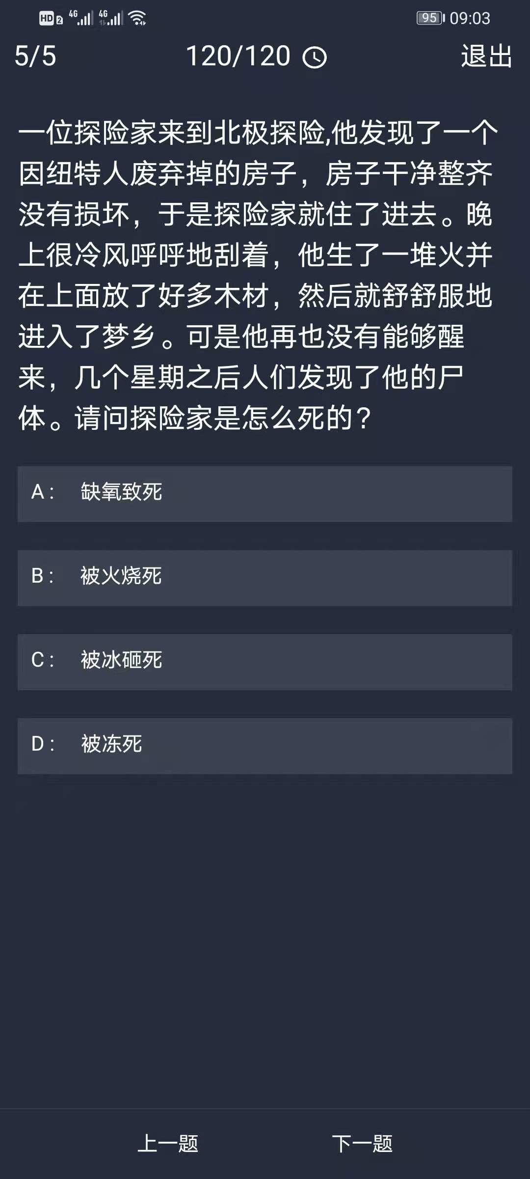 答案解析:因纽特人的房子是用冰块造成的冰屋,探险家在冰屋里生活会导致冰块融化,冰屋结构边松散然后倒塌,所以探险家是被冰屋上掉下来的冰块砸死的。