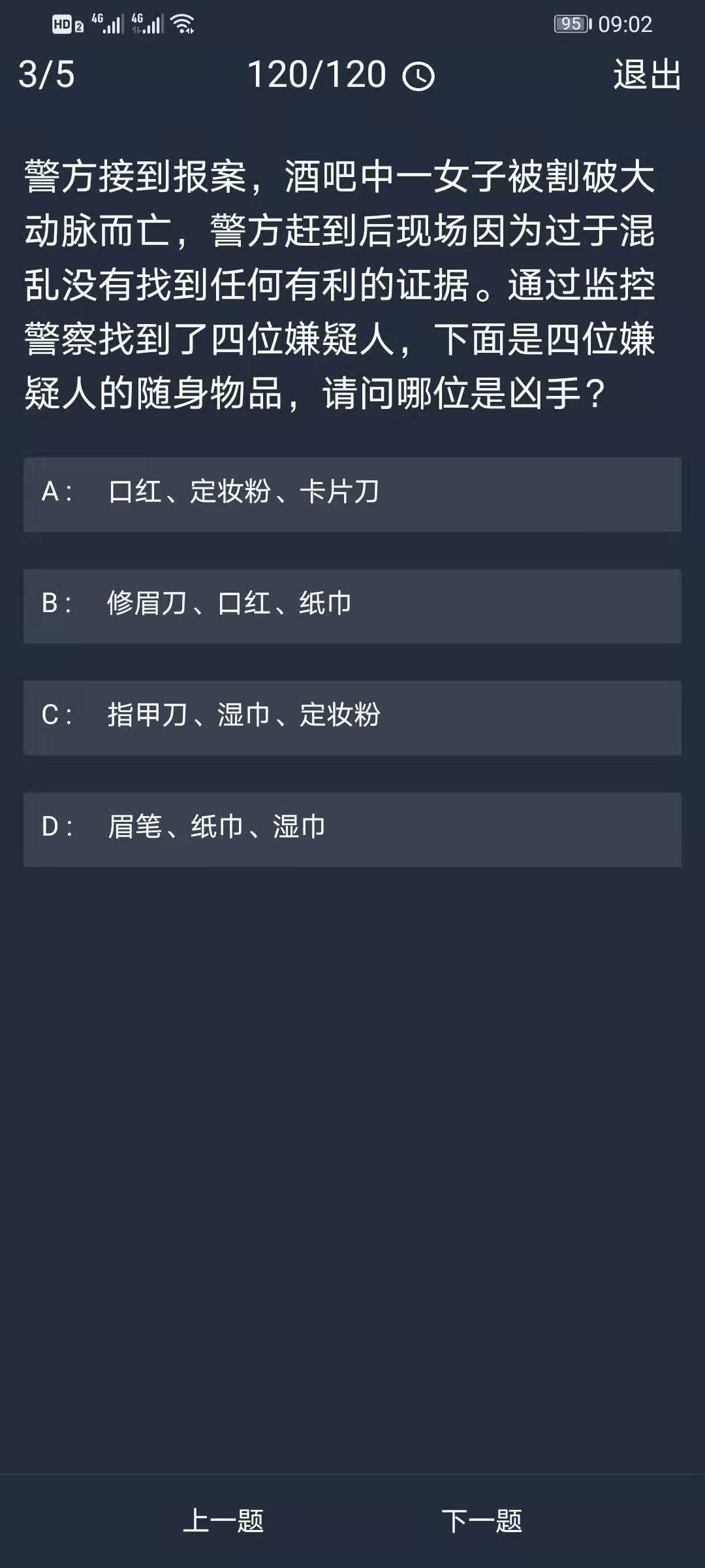 3、警方接到报案,酒吧中一女子被割破大动脉而亡,警方赶到后现场因为过于混乱没有找到任何有利的证据。通过监控警察找到了四位嫌疑人,下面是四位嫌疑人的随身物品,请问哪位是凶手?