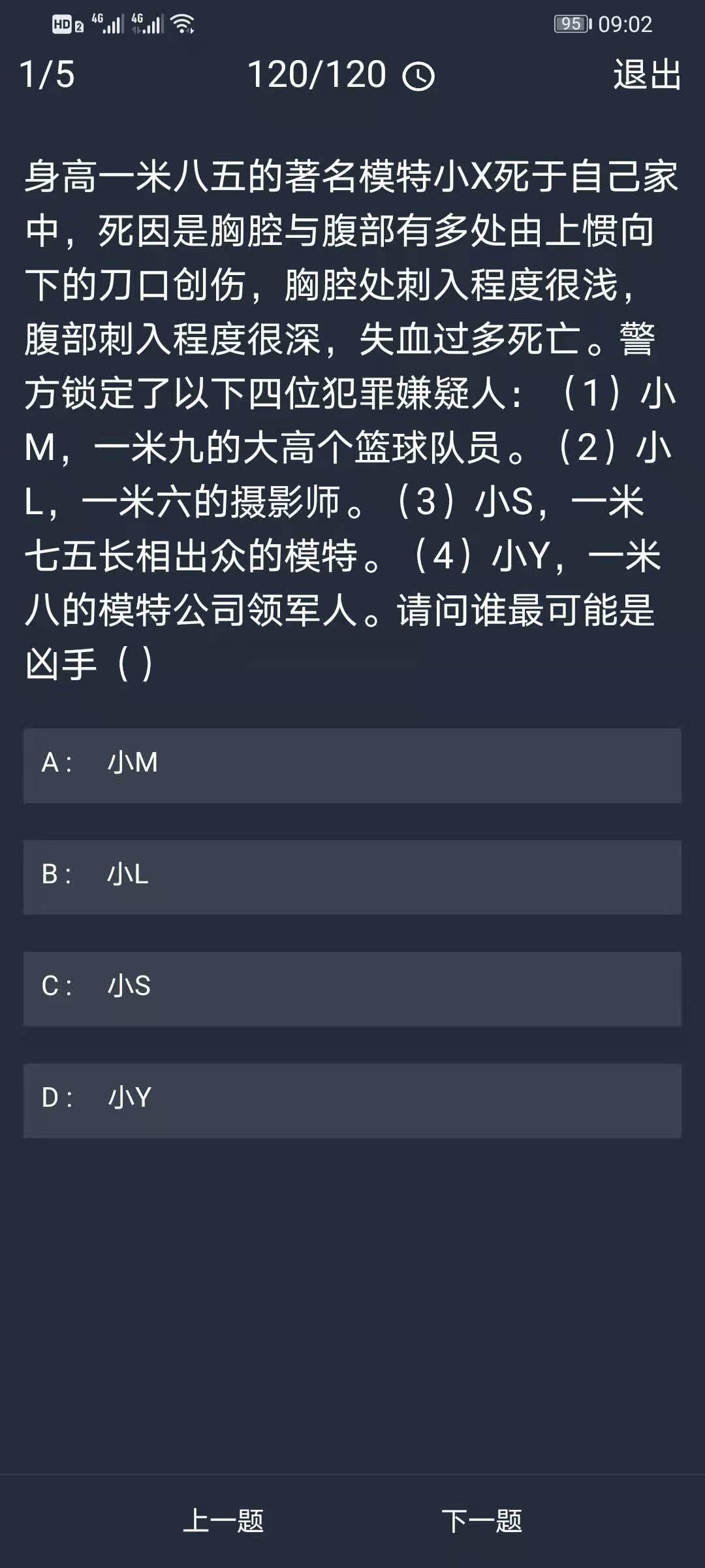 1、身高一米八五的著名模特小X死于自己家中,死因是胸腔与腹部有多处由上惯向下的刀口创伤,胸腔处刺入程度很浅,腹部刺入程度很深,失血过多死亡。警方锁定了以下四位犯罪嫌疑人:(1)小M,一米九的大高个篮球队员。(2)小L,一米六的摄影师。(3)小S,一米七五长相出众的模特。(4)小Y,一米八的模特公司领军人。请问谁最可能是凶手()