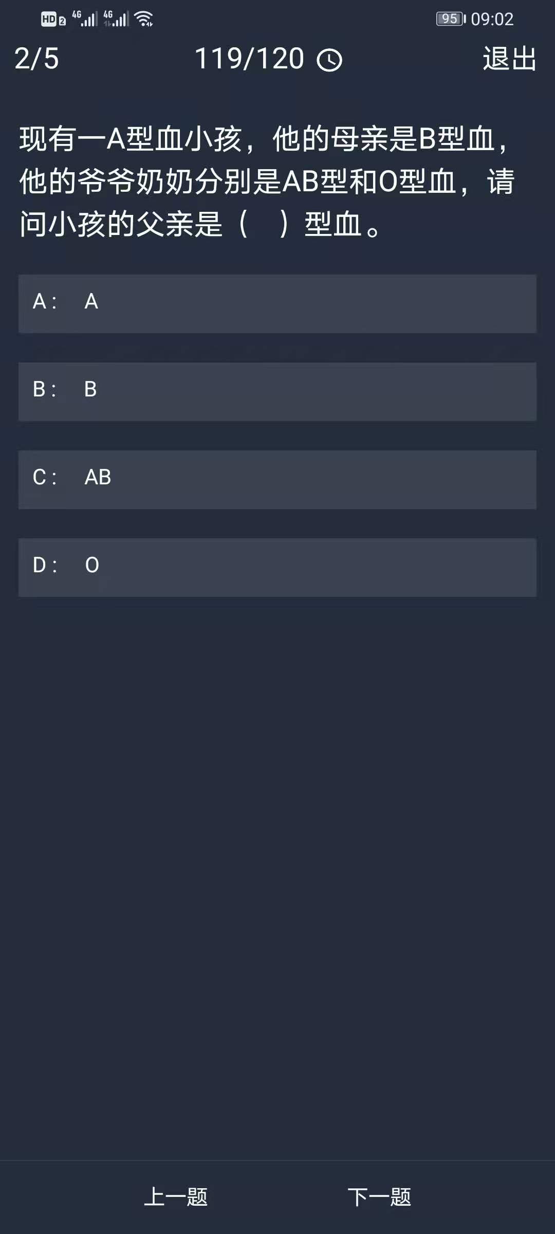 2、现有一A型血小孩,他的母亲是B型血,他的爷爷奶奶分别是AB型和O型血,请问小孩的父亲是()型血。