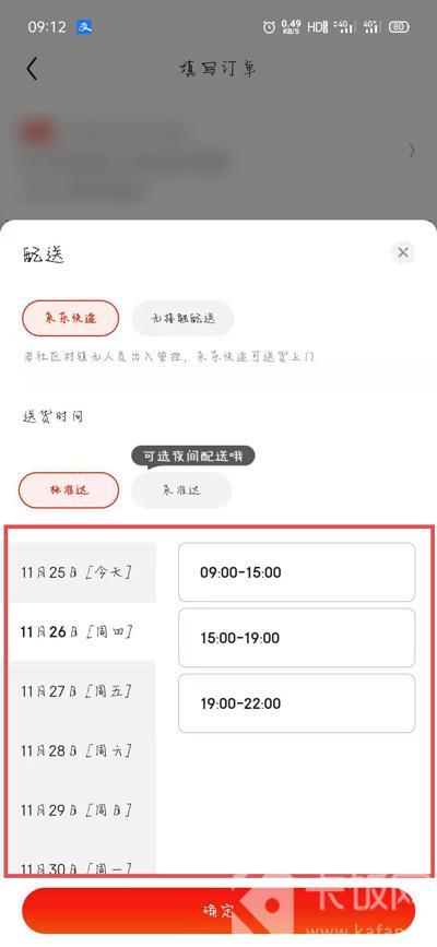 4、选择好配送时间之后,点击【确定】之后,提交订单页面下方即可显示送货上门时间。