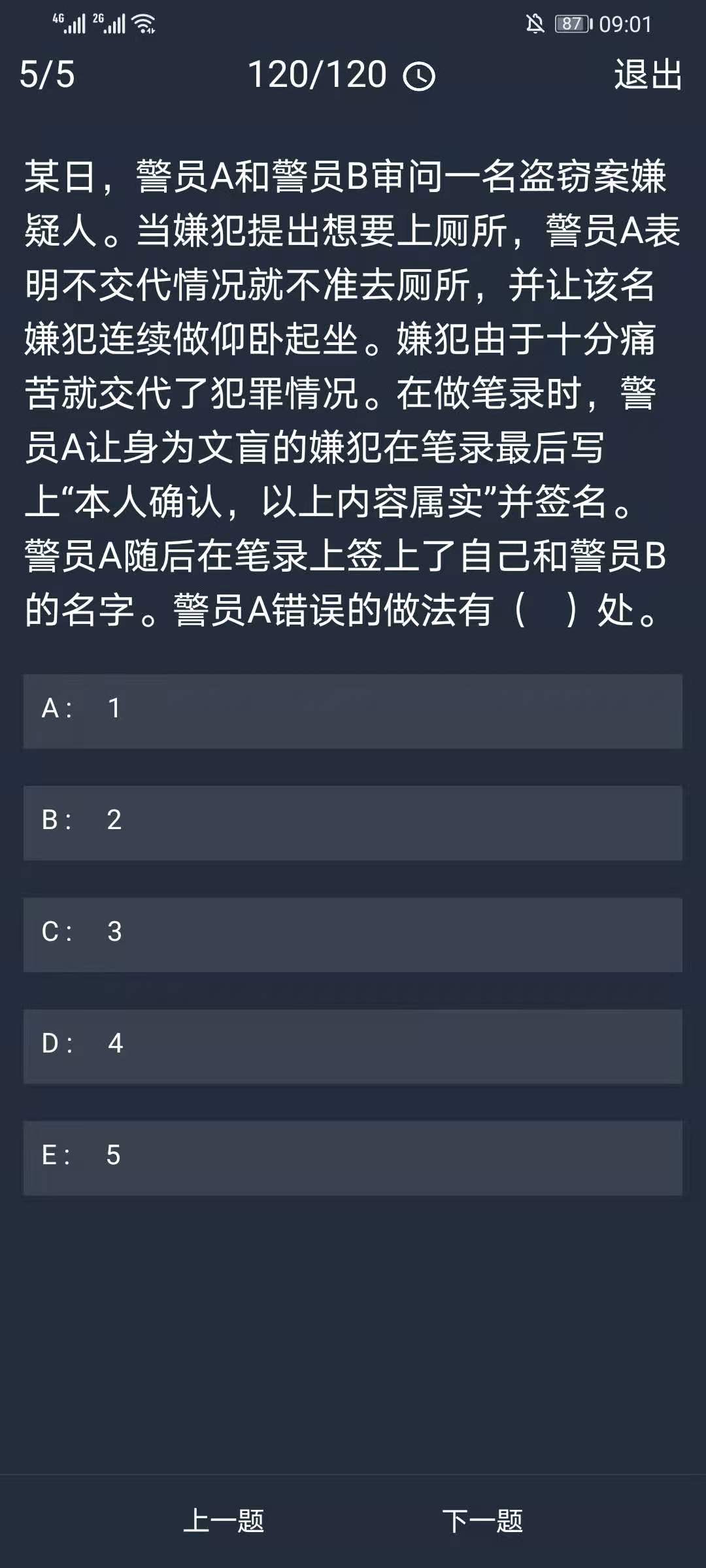 5、某日,警员A和警员B审问一名盗窃案嫌疑人。当嫌犯提出想要上厕所,警员A表明不交代情况就不准去厕所,并让该名嫌犯连续做仰卧起坐。嫌犯由于十分痛苦就交代了犯罪情况。在做笔录时,警员A让身为文盲的嫌犯在笔录最后写上“本人确认,以上内容属实"并签名。警员A随后在笔录上签上了自己和警员B的名字。警员A错误的做法有()处。