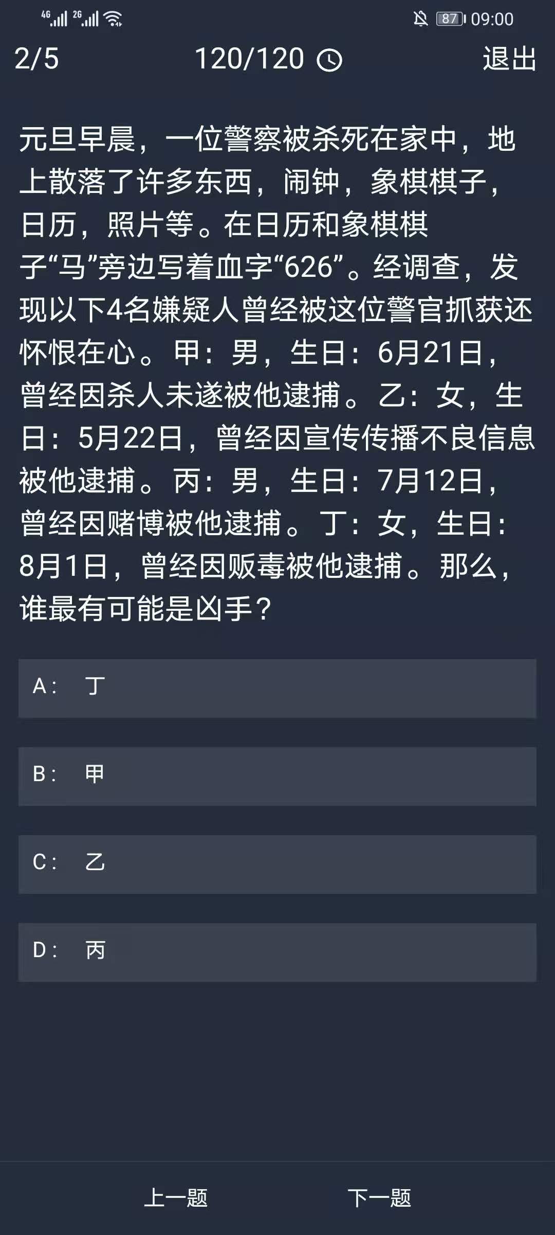 2、元旦早晨,一位警察被杀死在家中,地上散落了许多东西,闹钟,象棋棋子,日历,照片等。在日历和象棋棋子“马"旁边写着血字"626”。经调查,发现以下4名嫌疑人曾经被这位警官抓获还怀恨在心。甲:男,生日:6月21日,曾经因杀人未遂被他逮捕。乙:女,生日:5月22日,曾经因宣传传播不良信息被他逮捕。丙:男,生日:7月12日,曾经因赌博被他逮捕。丁:女,生日:8月1日,曾经因贩毒被他逮捕。那么,谁最有可能是凶手?