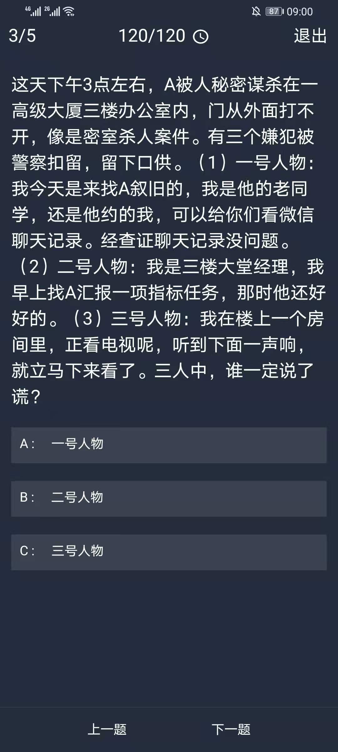 3、这天下午3点左右,A被人秘密谋杀在一高级大厦三楼办公室内,门从外面打不开,像是密室杀人案件。有三个嫌犯被警察扣留,留下口供。(1)一号人物:我今天是来找A叙旧的,我是他的老同学,还是他约的我,可以给你们看微信聊天记录。经查证聊天记录没问题。(2)二号人物:我是三楼大堂经理,我早上找A汇报一项指标任务,那时他还好好的。(3)三号人物:我在楼上一个房间里,正看电视呢,听到下面一声响,就立马下来看了。三人中,谁一定说了谎?