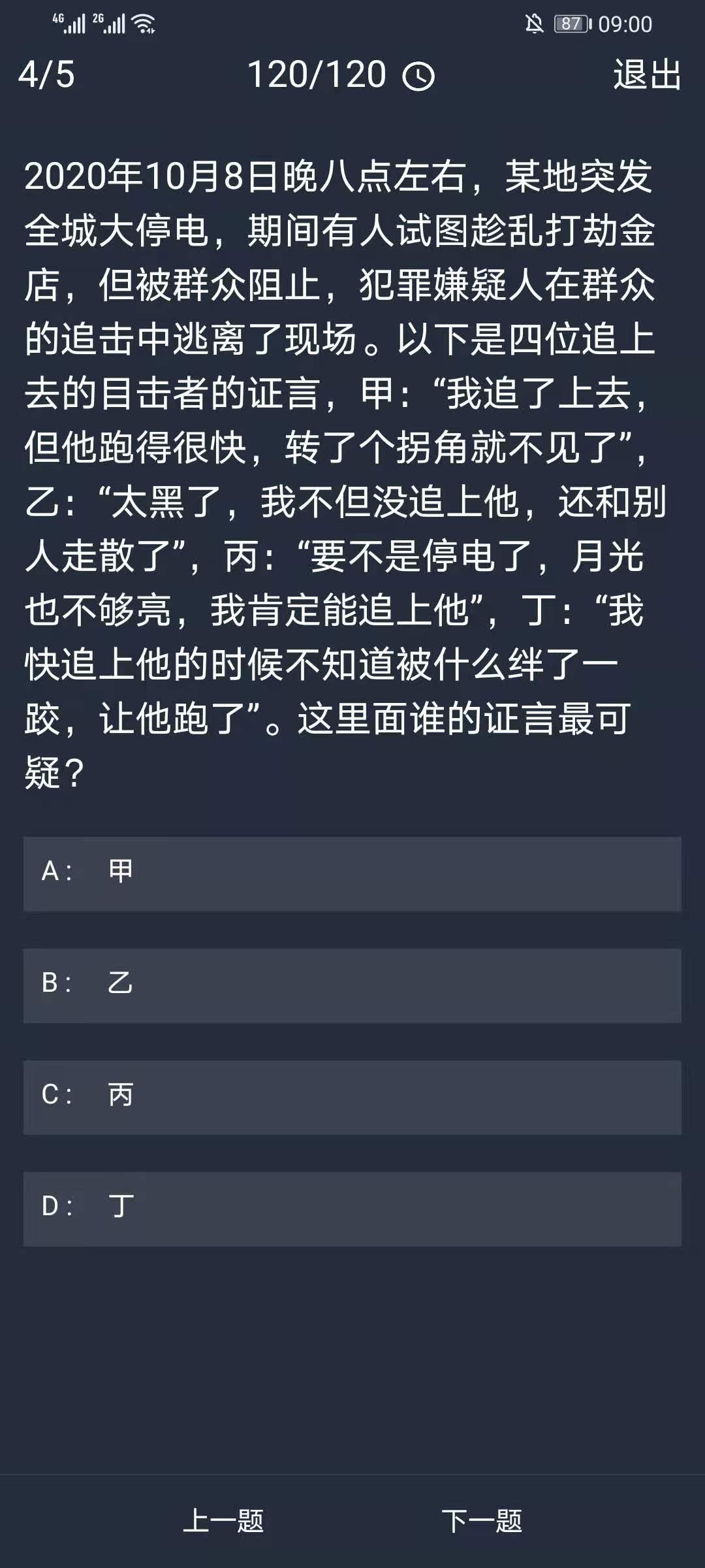 4、2020年10月8日晚八点左右,某地突发全城大停电,期间有人试图趁乱打劫金店,但被群众阻止,犯罪嫌疑人在群众的追击中逃离了现场。以下是四位追上去的目击者的证言,甲:“我追了上去,但他跑得很快,转了个拐角就不见了”,乙:“太黑了,我不但没追上他,还和别人走散了”,丙:“要不是停电了,月光也不够亮,我肯定能追上他”,丁:“我快追上他的时候不知道被什么绊了一跤,让他跑了"。这里面谁的证言最可疑?