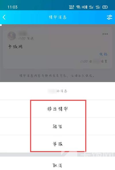 8、点击右上角的三个点【更多】,可选择将精华消息【移出精华】、【转发】、【举报】等操作。