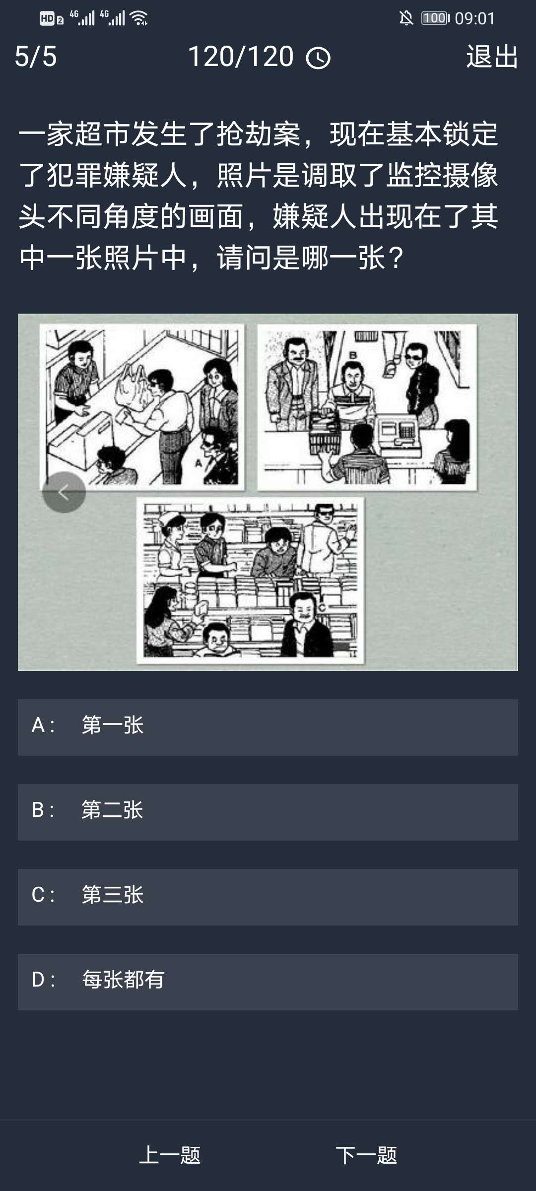 5、一家超市发生了抢劫案,现在基本锁定了犯罪嫌疑人,照片是调取了监控摄像头不同角度的画面,嫌疑人出现在了其中一张照片中,请问是哪一张?