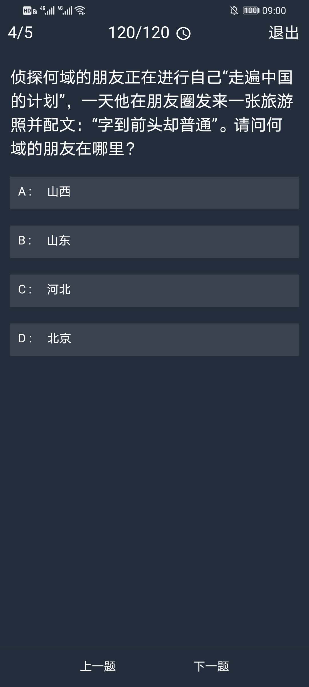 4、侦探何域的朋友正在进行自己“走遍中国的计划”,一天他在朋友圈发来一张旅游照并配文:“字到前头却普通”。请问何域的朋友在哪里?