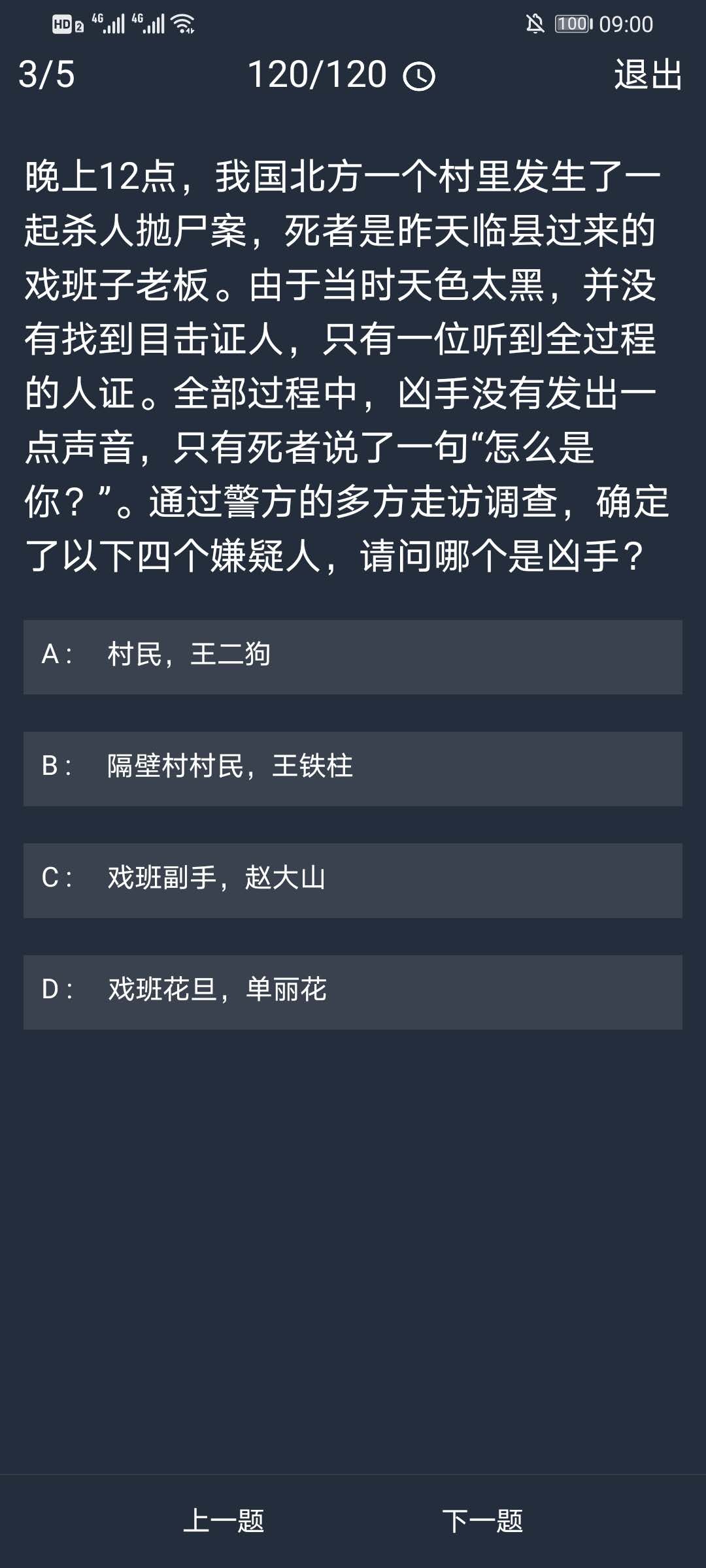 3、晚上12点,我国北方一个村里发生了一起杀人抛尸案,死者是昨天临县过来的戏班子老板。由于当时天色太黑,并没有找到目击证人,只有一位听到全过程的人证。全部过程中,凶手没有发出一点声音,只有死者说了一句“怎么是你?”。通过警方的多方走访调查,确定了以下四个嫌疑人,请问哪个是凶手?