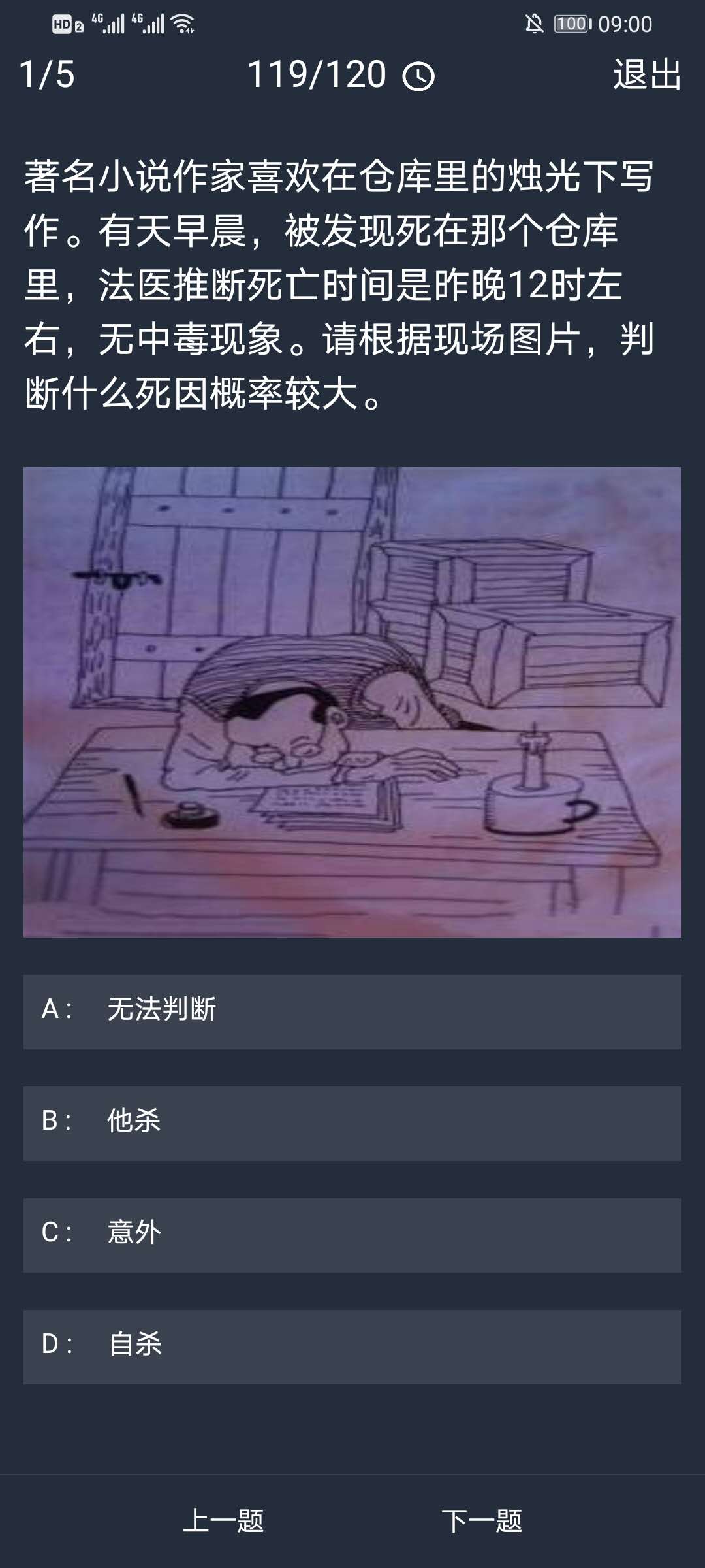 答案解析:因为桌上的蜡烛并没有烧尽,桌面也很整齐,所以意外猝死的几率很小。无中毒现象,现场也没发现吊绳等工具,死者掐死自己活着憋死自己的概率更小。综合判断,他杀的可能性大一点,凶手杀害死者后,吹灭了蜡烛(怕有人看到灯光前来,所以想营造出死者已睡觉的假象)。