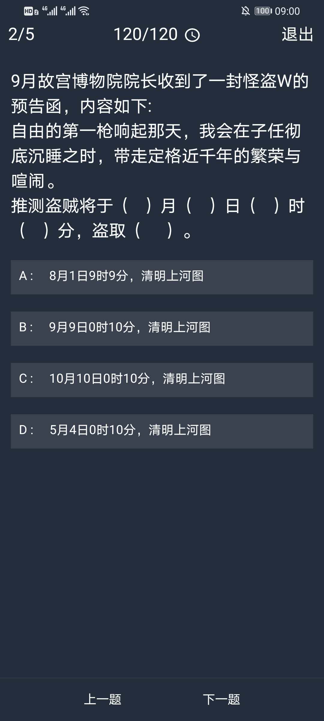 答案解析:中国近代史有两个著名的第一枪,即1911年10月10日的武昌首义和1927年8月1日的南昌起义。由于预告函是今日收到的,所以排除8月1日,选择10月10日。子任是毛泽东主席的笔名,他于1976年9月9月0时10分逝世。清明上河图描绘了北宋汴河沿岸的风光和繁华景象,距今有900多年。综上推测盗贼将于10月10日0时10分,盗取清明上河图。