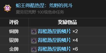 1、完成夏劳尼荒野100级危命任务【蛇王得酷热涅:荒野的死斗】可获得【得酷热涅的鳞片】;