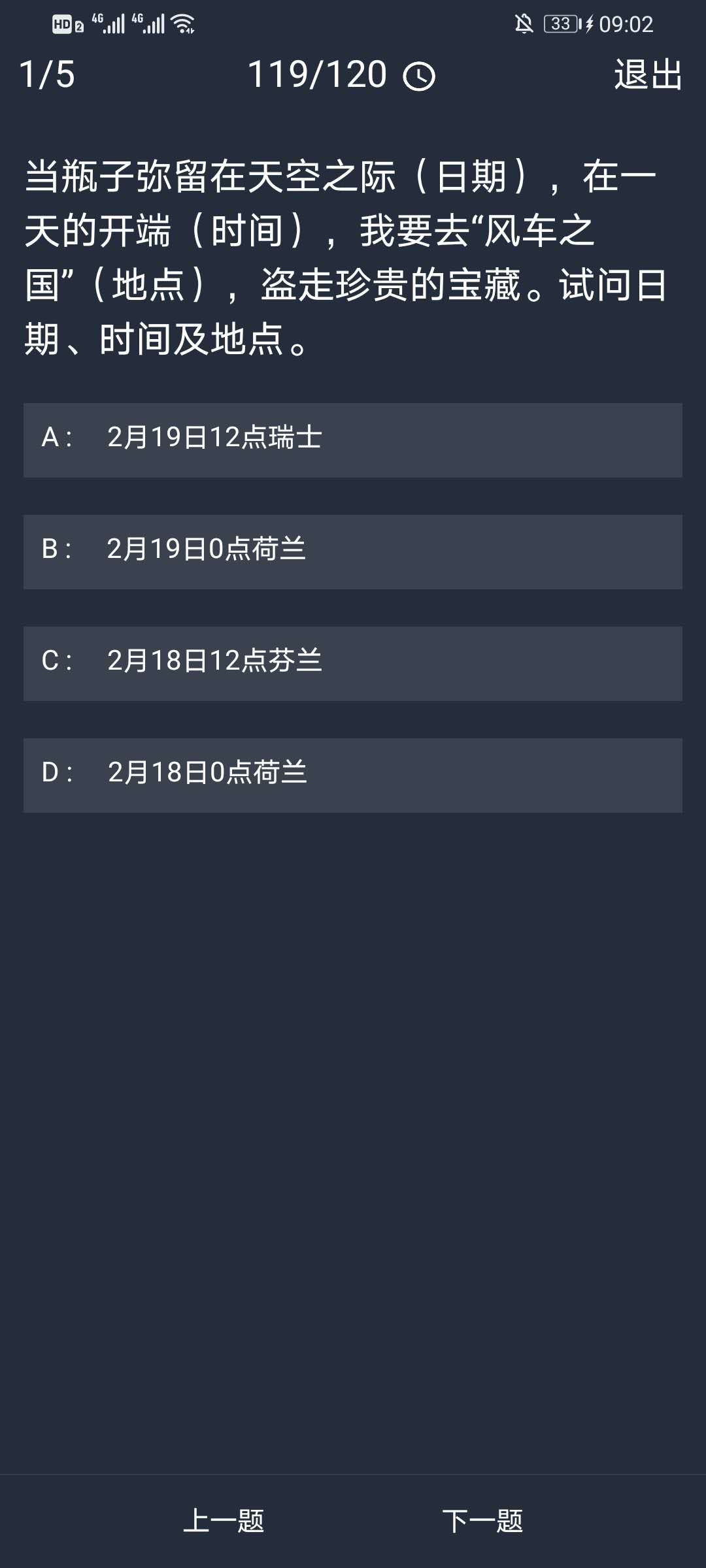 答案解析:当瓶子弥留在天空之际,意为水瓶座的最后一天,即为2月18日。一天的开端即为凌晨0点。而"风车之国"即为荷兰。因为荷兰的海拔较低,雨水充沛,水域面积约占领土面积的六分之一,若不进行排水,会影响荷兰人的正常生活,而经过当地人长期的研究发现,荷兰因地理位置,适合用风力排水,也就制造了风车,目前荷兰约有两千多架风车,故称“风车少国"