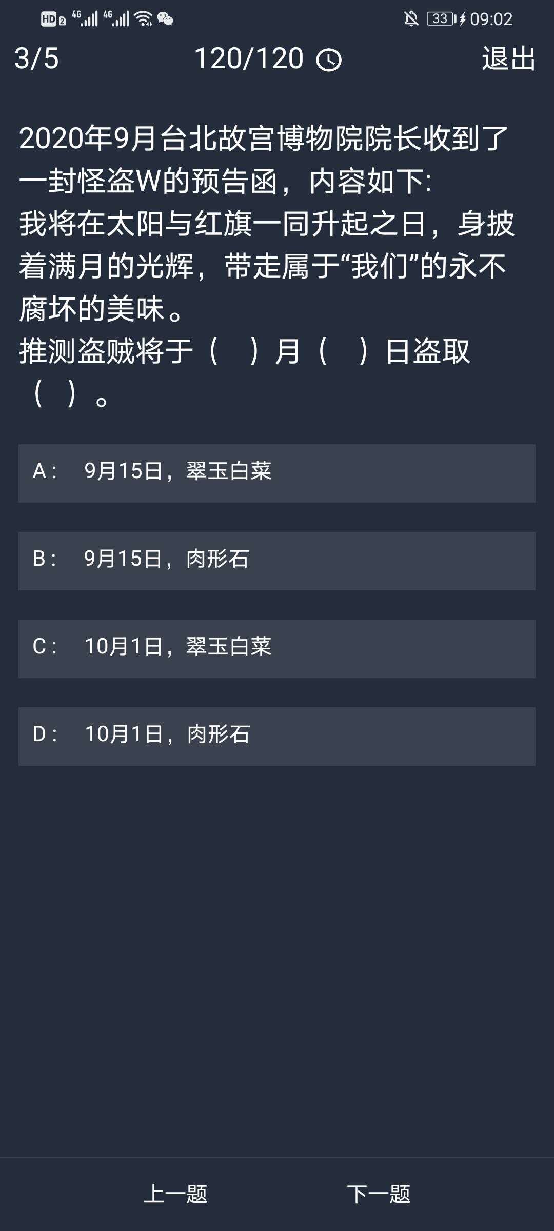 3、2020年9月台北故宫博物院院长收到了一封怪盗W的预告函,内容如下:我将在太阳与红旗一同升起之日,身披着满月的光辉,带走属于“我们"的永不腐坏的美味。推测盗贼将于()月()日盗取( )。
