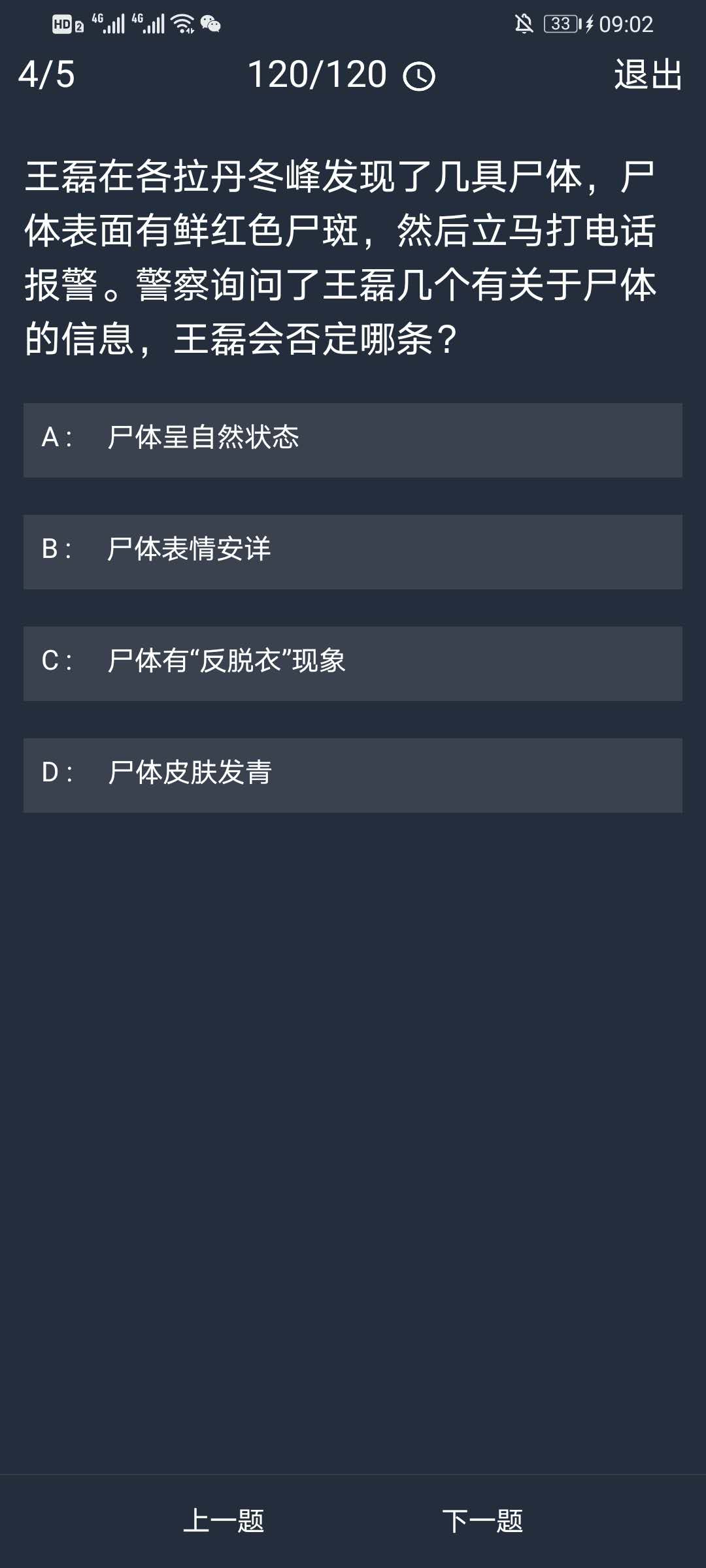 4、王磊在各拉丹冬峰发现了几具尸体,尸体表面有鲜红色尸斑,然后立马打电话报警。警察询问了王磊几个有关于尸体的信息,王磊会否定哪条?