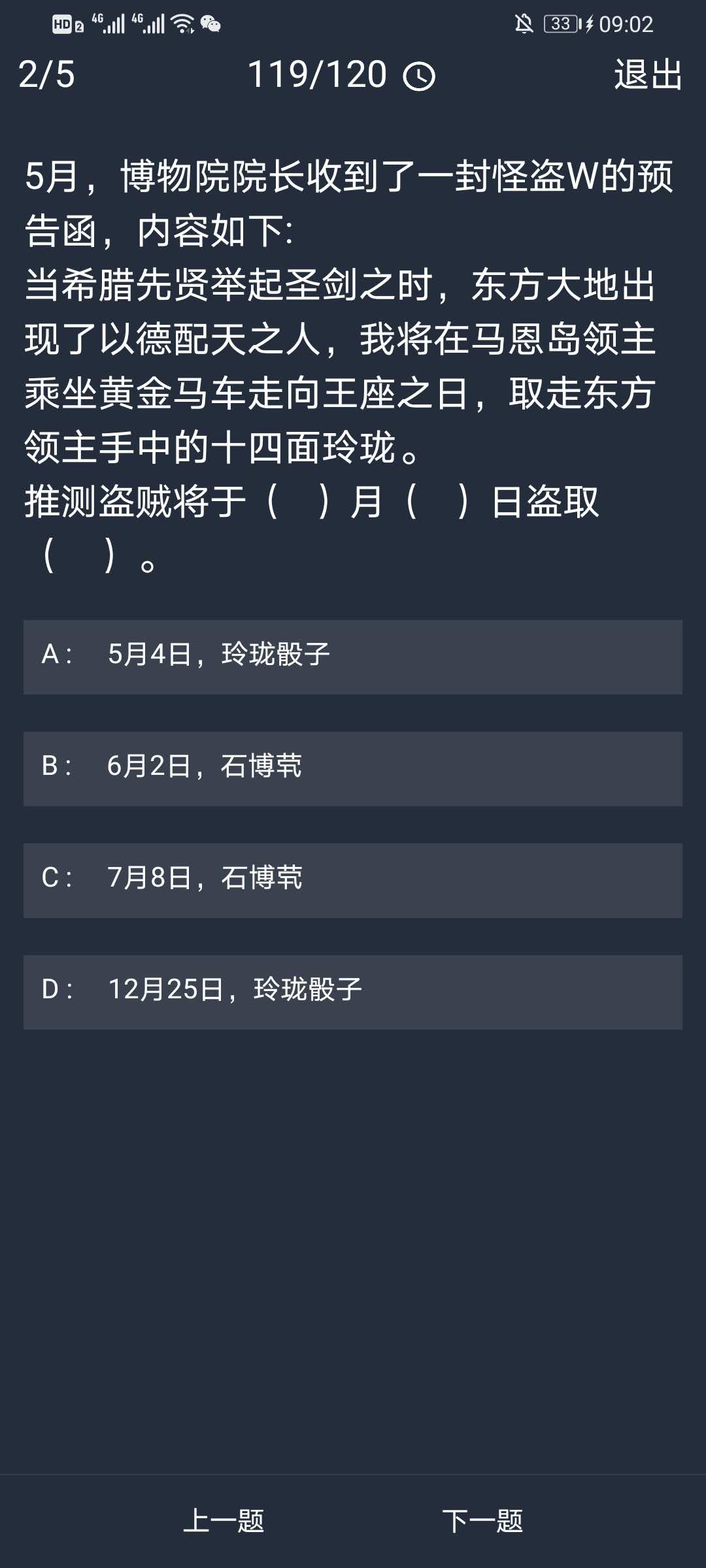 2、5月,博物院院长收到了一封怪盗W的预告函,内容如下:当希腊先贤举起圣剑之时,东方大地出现了以德配天之人,我将在马恩岛领主乘坐黄金马车走向王座之日,取走东方领主手中的十四面玲珑。推测盗贼将于())月()日盗取( )。