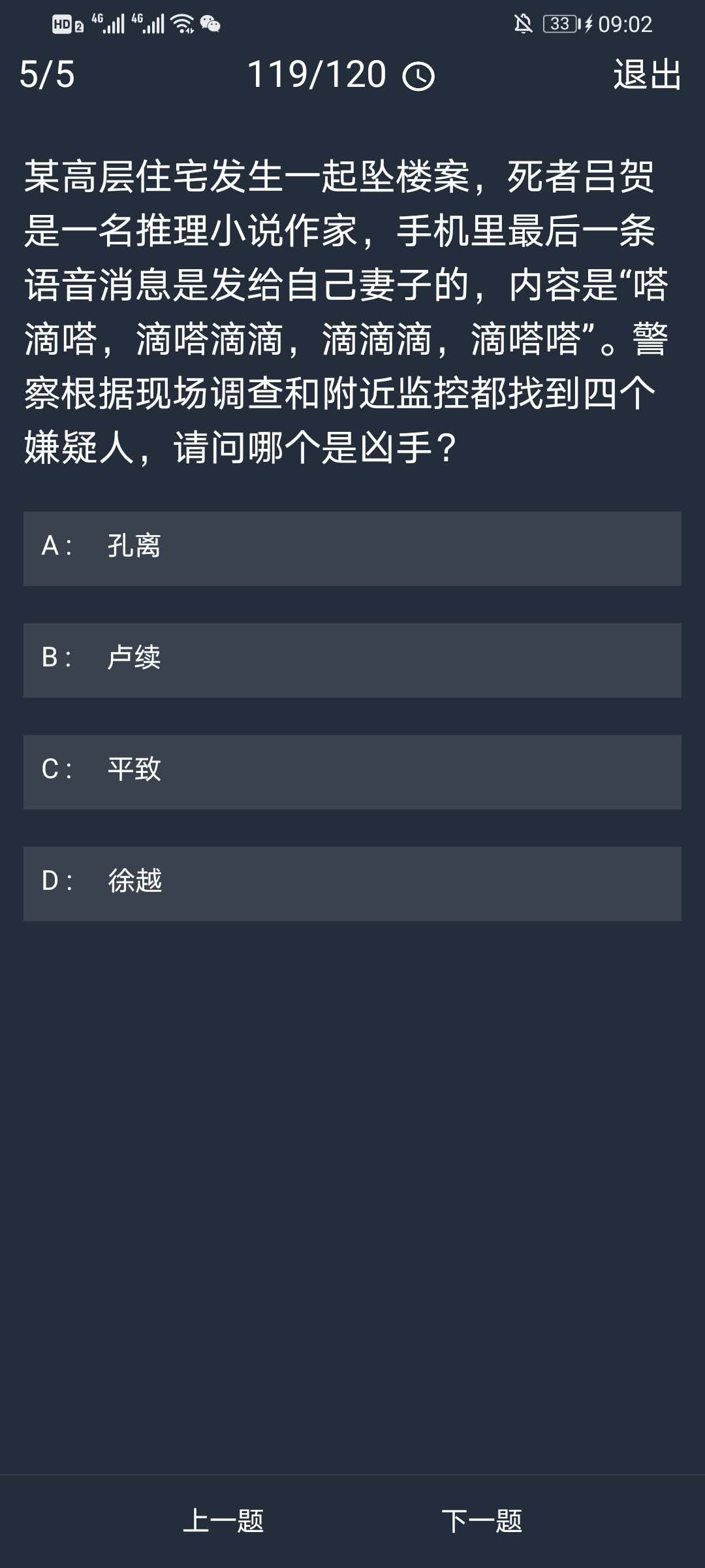 5、某高层住宅发生一起坠楼案,死者吕贺是一名推理小说作家,手机里最后一条语音消息是发给自己妻子的,内容是“嗒滴嗒,滴嗒滴滴,滴滴滴,滴嗒嗒”。警察根据现场调查和附近监控都找到四个嫌疑人,请问哪个是凶手?