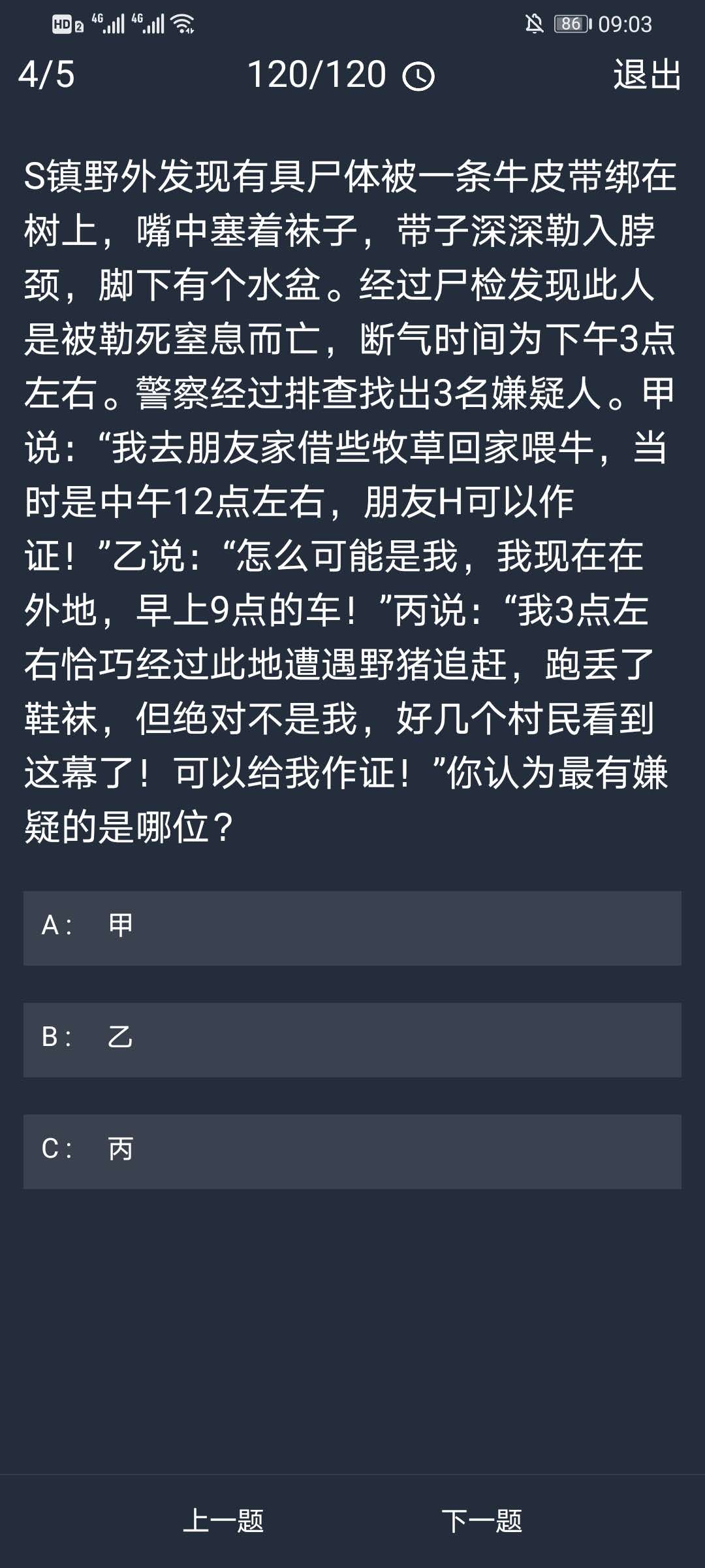 答案解析:乙最有嫌疑。提前准备好牛皮带子浸泡在水中一夜让牛皮充分吸水,将被害人绑在树上用牛皮带子绕住其脖颈,自行离开。中午及下午强烈的阳光导致牛皮带子水分蒸发开始收缩,最终勒死死者。甲和丙被排除原因是牛皮带子不可能短时间内蒸发勒死被害人。