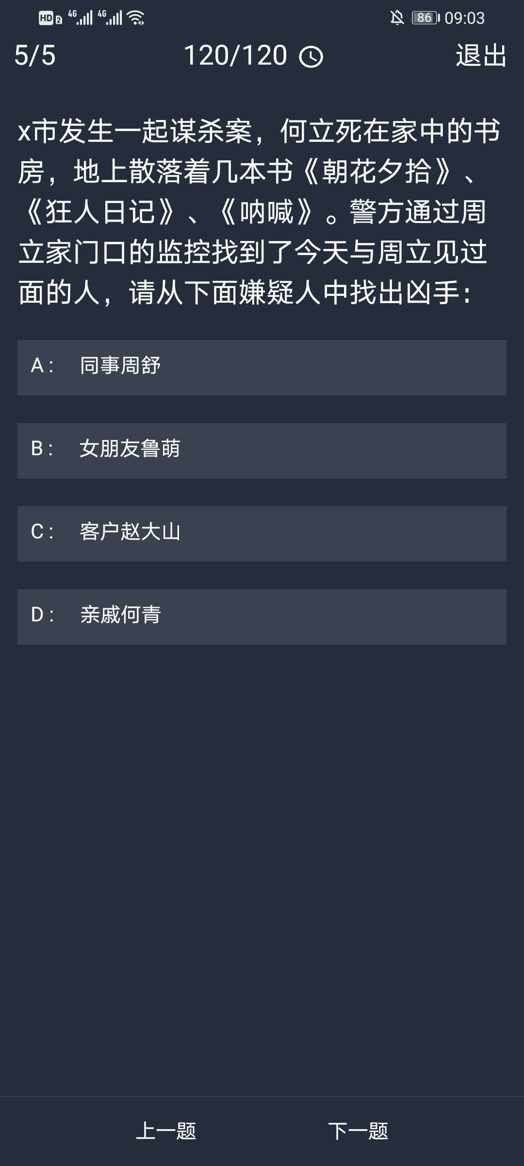 5、x市发生一起谋杀案,何立死在家中的书房,地上散落着几本书《朝花夕拾》、《狂人日记》、《呐喊》。警方通过周立家门口的监控找到了今天与周立见过面的人,请从下面嫌疑人中找出凶手: