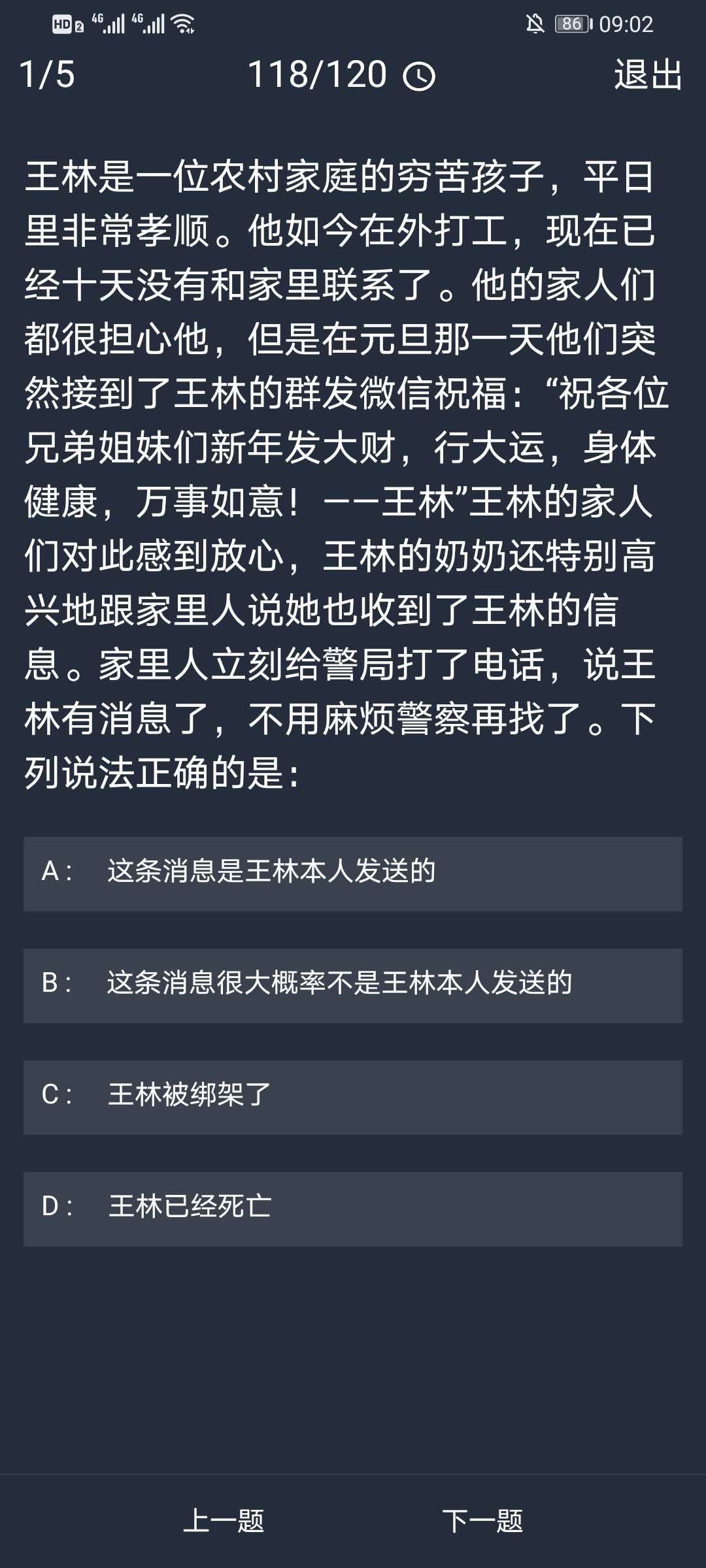答案解析:王林是一位农村出来的孩子,很注重辈分也很孝顺。在他的群发微信中称呼所有人为"兄弟姐妹”,但是王林的奶奶也收到了这条信息,所以这个称呼是很不合适的。因此这条消息大概率不是王林本人发送的。王林死亡与被绑架两项属于过度推断。