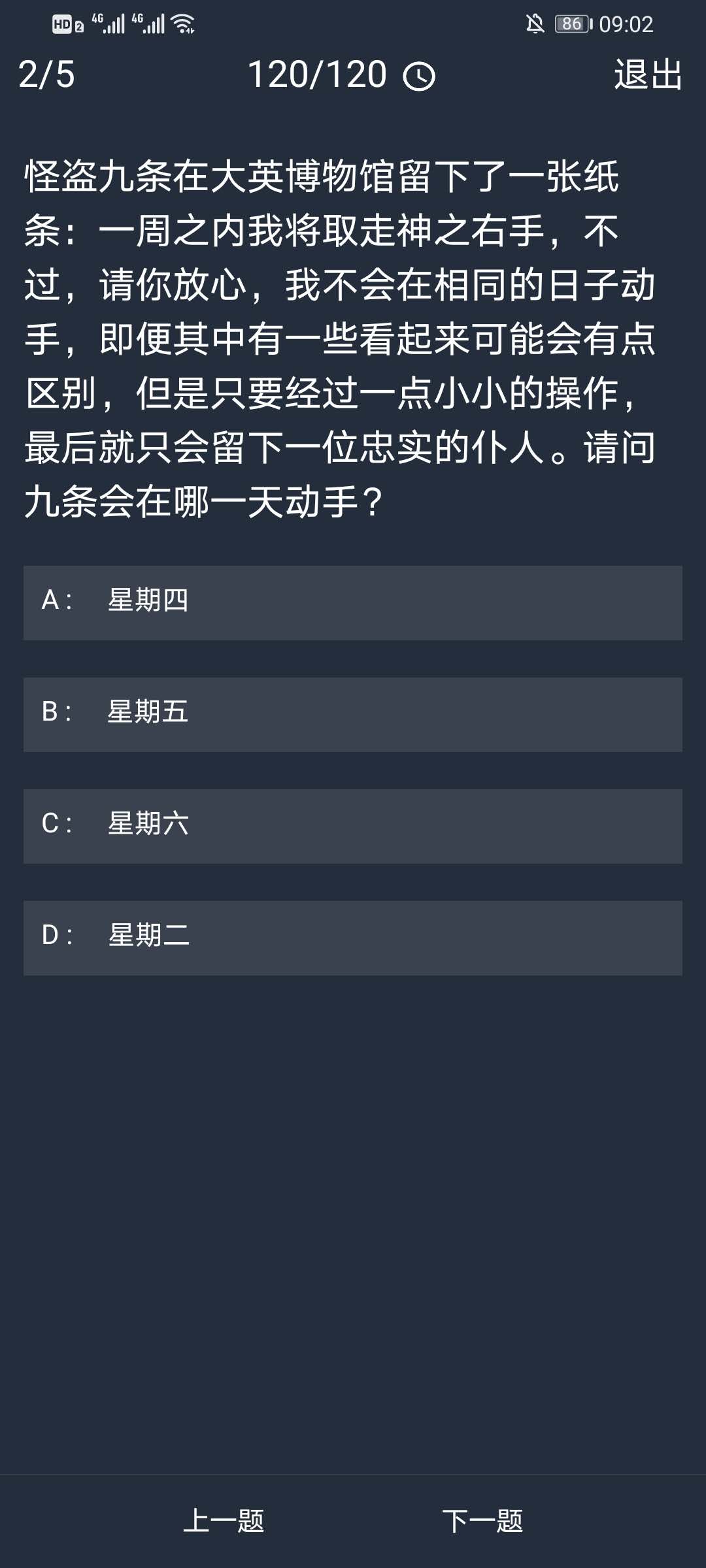 2、怪盗九条在大英博物馆留下了一张纸条:一周之内我将取走神之右手,不过,请你放心,我不会在相同的日子动手,即便其中有一些看起来可能会有点区别,但是只要经过一点小小的操作,最后就只会留下一位忠实的仆人。请问九条会在哪一天动手?