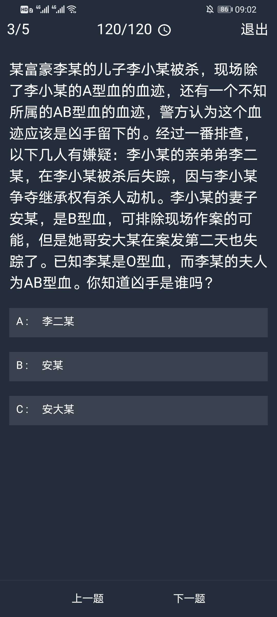 3、某富豪李某的儿子李小某被杀,现场除了李小某的A型血的血迹,还有一个不知所属的AB型血的血迹,警方认为这个血迹应该是凶手留下的。经过一番排查,以下几人有嫌疑:李小某的亲弟弟李二某,在李小某被杀后失踪,因与李小某争夺继承权有杀人动机。李小某的妻子安某,是B型血,可排除现场作案的可能,但是她哥安大某在案发第二天也失踪了。已知李某是O型血,而李某的夫人为AB型血。你知道凶手是谁吗?