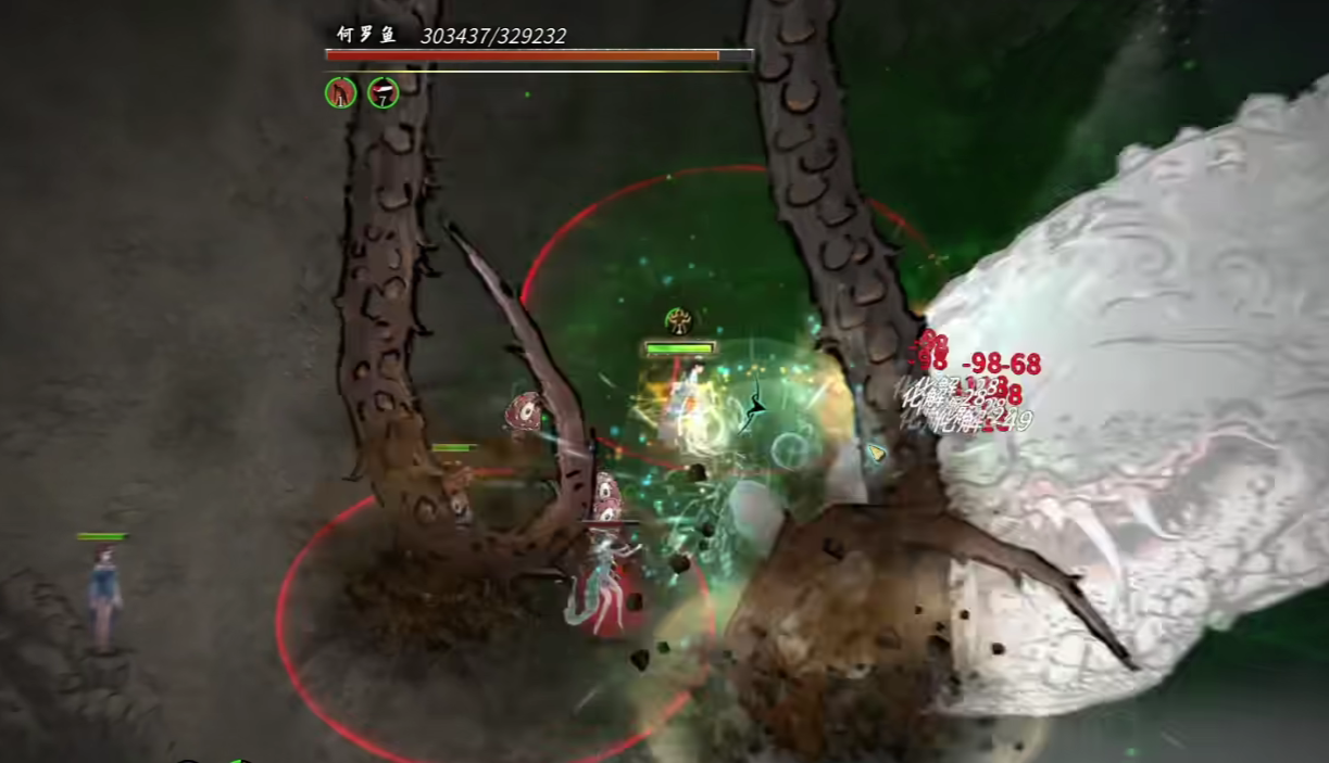 何罗鱼总共有三个技能,第一个技能为触手攻击,当何罗鱼释放该技能时,就能够对在场全屏的所有目标造成aoe伤害,在伤害释放的期间,何罗鱼还会召唤小怪辅助,地面的裂痕当中,不仅会出现陷阱,也会蔓延出大量的小怪,这些小怪都是需要玩家及时清理的,否则会酿成大祸。