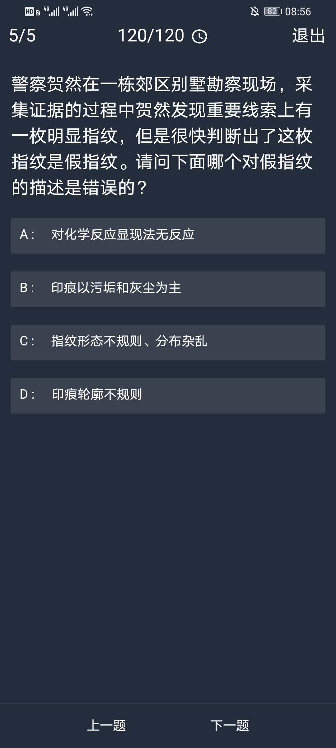 5、警察贺然在一栋郊区别墅勘察现场,采集证据的过程中贺然发现重要线索上有一枚明显指纹,但是很快判断出了这枚指纹是假指纹。请问下面哪个对假指纹的描述是错误的?