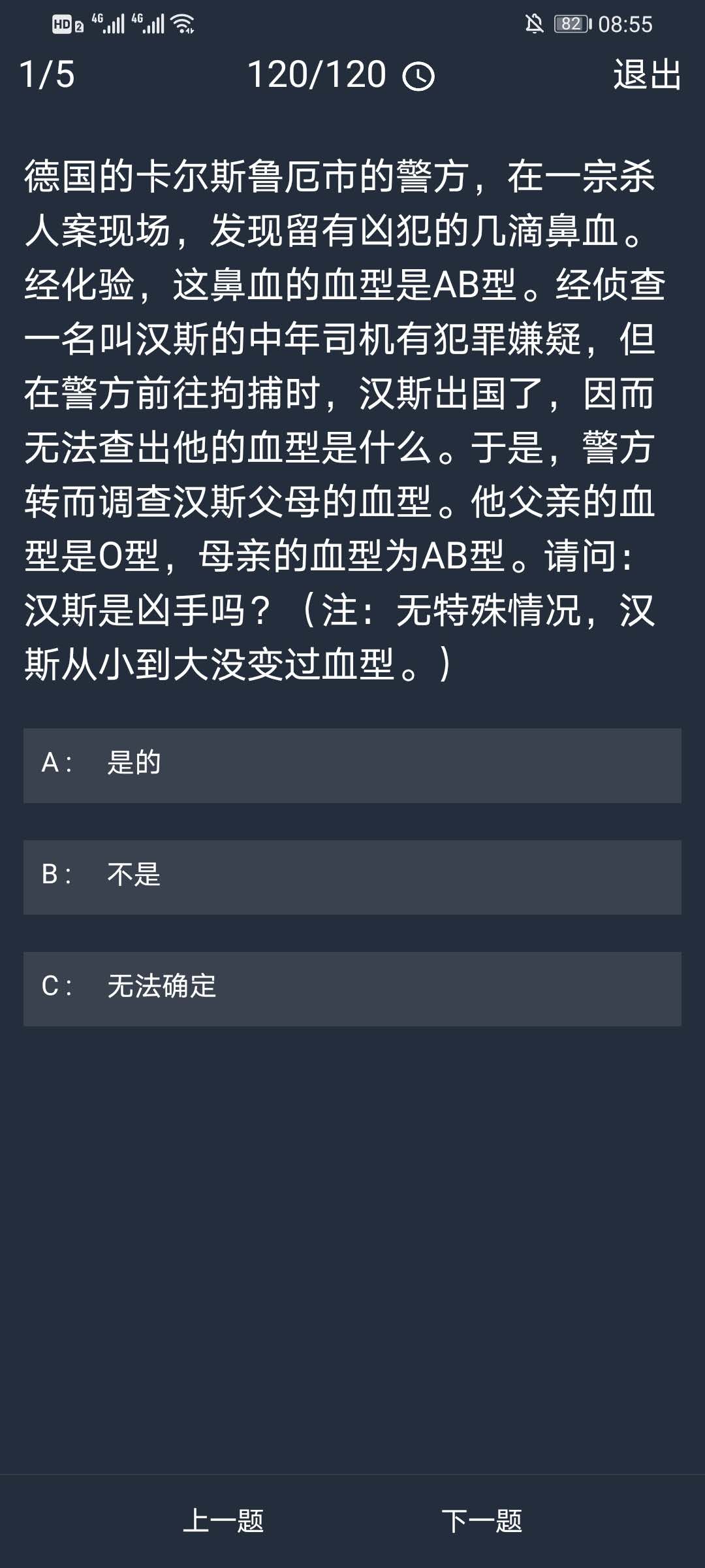 1、德国的卡尔斯鲁厄市的警方,在一宗杀人案现场,发现留有凶犯的几滴鼻血。经化验,这鼻血的血型是AB型。经侦查一名叫汉斯的中年司机有犯罪嫌疑,但在警方前往拘捕时,汉斯出国了,因而无法查出他的血型是什么。于是,警方转而调查汉斯父母的血型。他父亲的血型是O型,母亲的血型为AB型。请问:汉斯是凶手吗?(注:无特殊情况,汉斯从小到大没变过血型。)