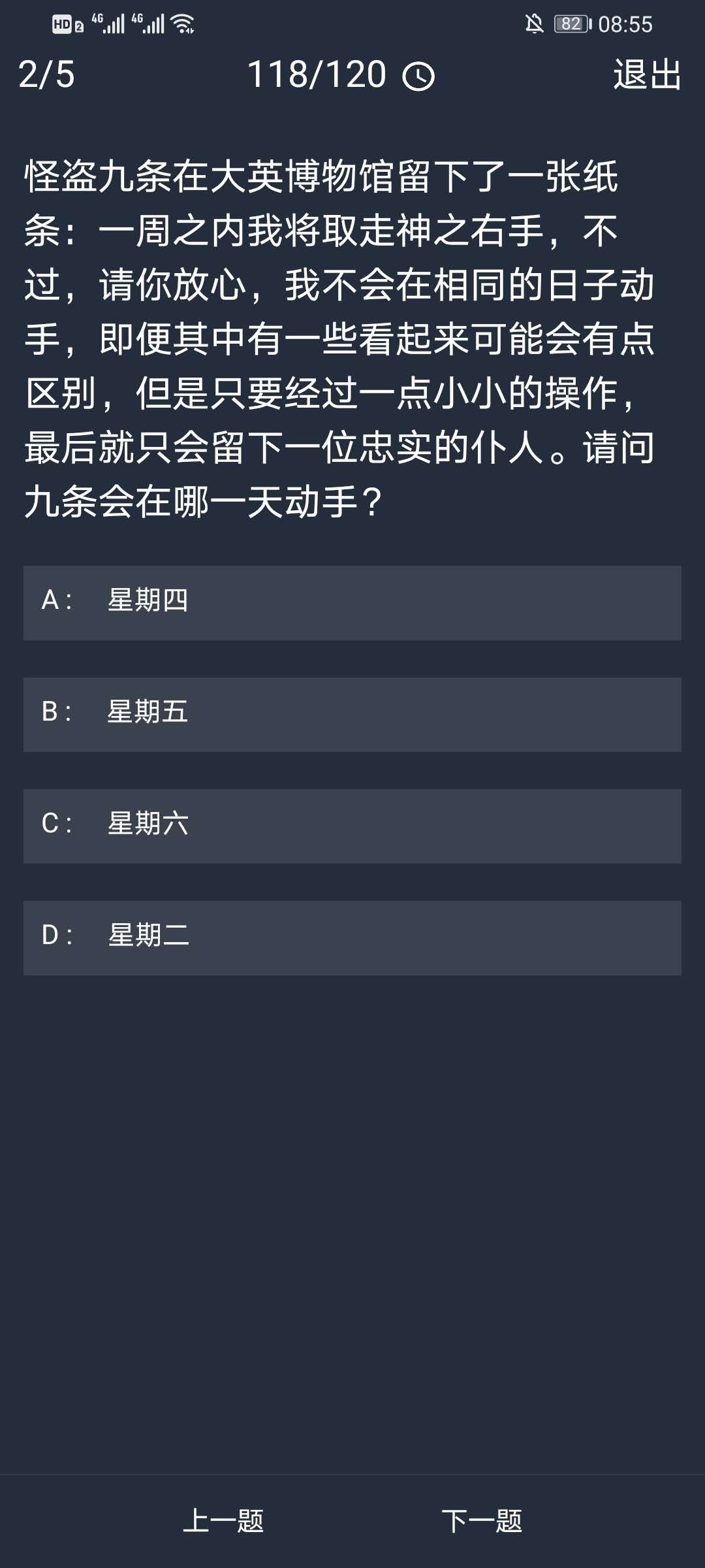 2、怪盗九条在大英博物馆留下了一张纸条:一周之内我将取走神之右手,不过,请你放心,我不会在相同的日子动手,即便其中有一些看起来可能会有点区别,但是只要经过一点小小的操作,最后就只会留下一位忠实的仆人。请问九条会在哪一天动手?