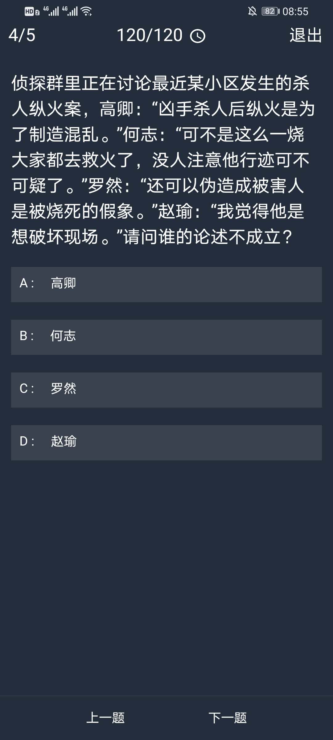 4、侦探群里正在讨论最近某小区发生的杀人纵火案,高卿:“凶手杀人后纵火是为了制造混乱。"何志:“可不是这么一烧大家都去救火了,没人注意他行迹可不可疑了。"罗然:“还可以伪造成被害人是被烧死的假象。"赵瑜:“我觉得他是想破坏现场。"请问谁的论述不成立?
