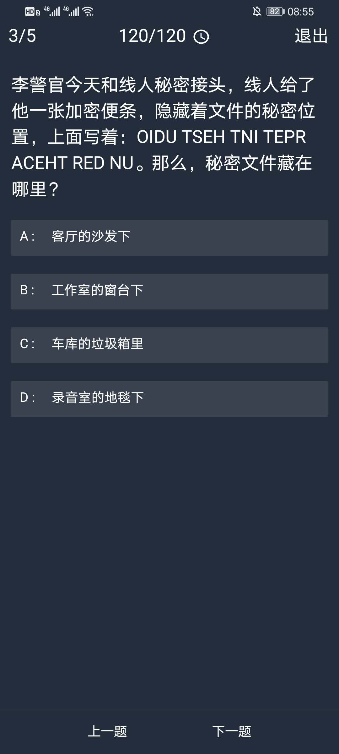 3、李警官今天和线人秘密接头,线人给了他一张加密便条,隐藏着文件的秘密位置,上面写着:OIDU TSEH TNI TEPRACEHT RED NU。那么,秘密文件藏在哪里?