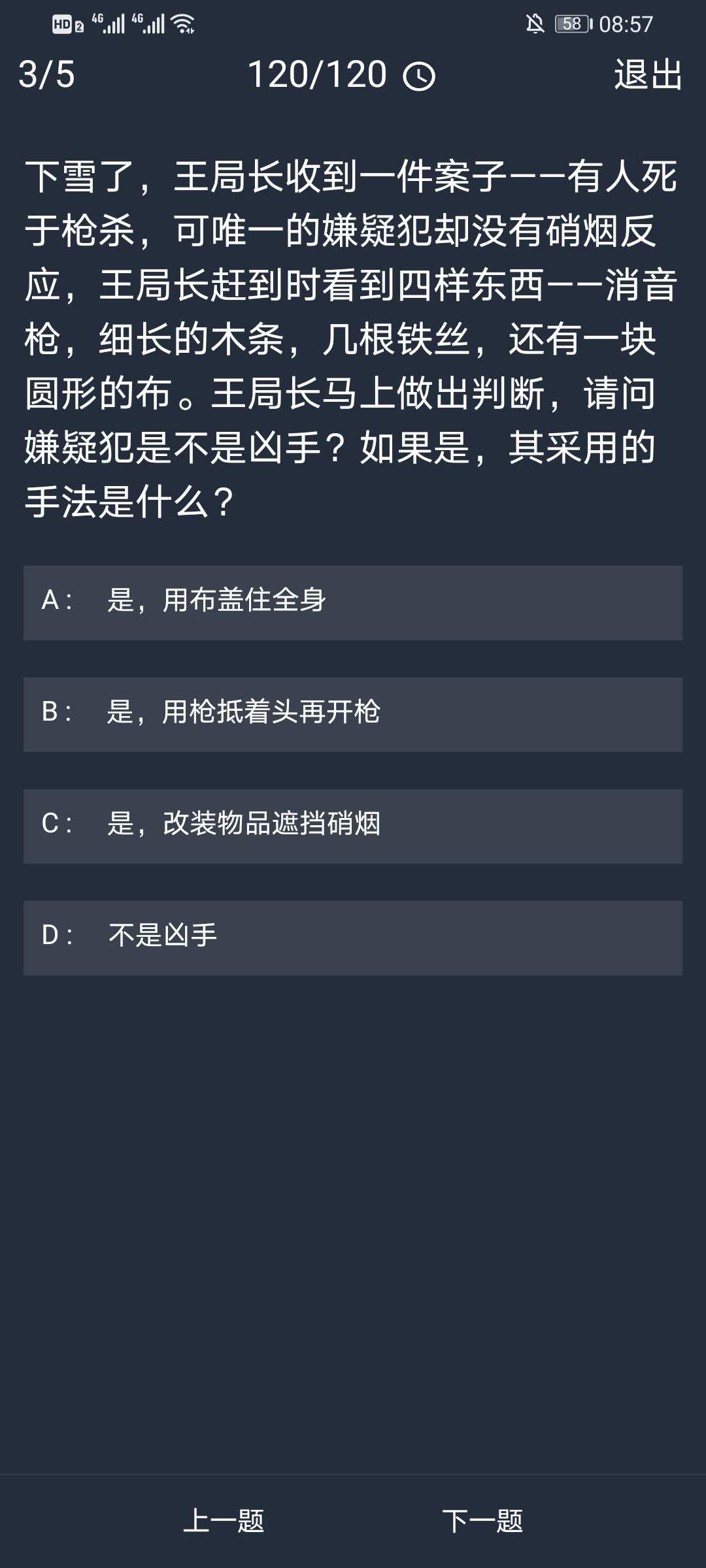 3、下雪了,王局长收到一件案子―一有人死于枪杀,可唯一的嫌疑犯却没有硝烟反应,王局长赶到时看到四样东西――消音枪,细长的木条,几根铁丝,还有一块圆形的布。王局长马上做出判断,请问嫌疑犯是不是凶手?如果是,其采用的手法是什么?