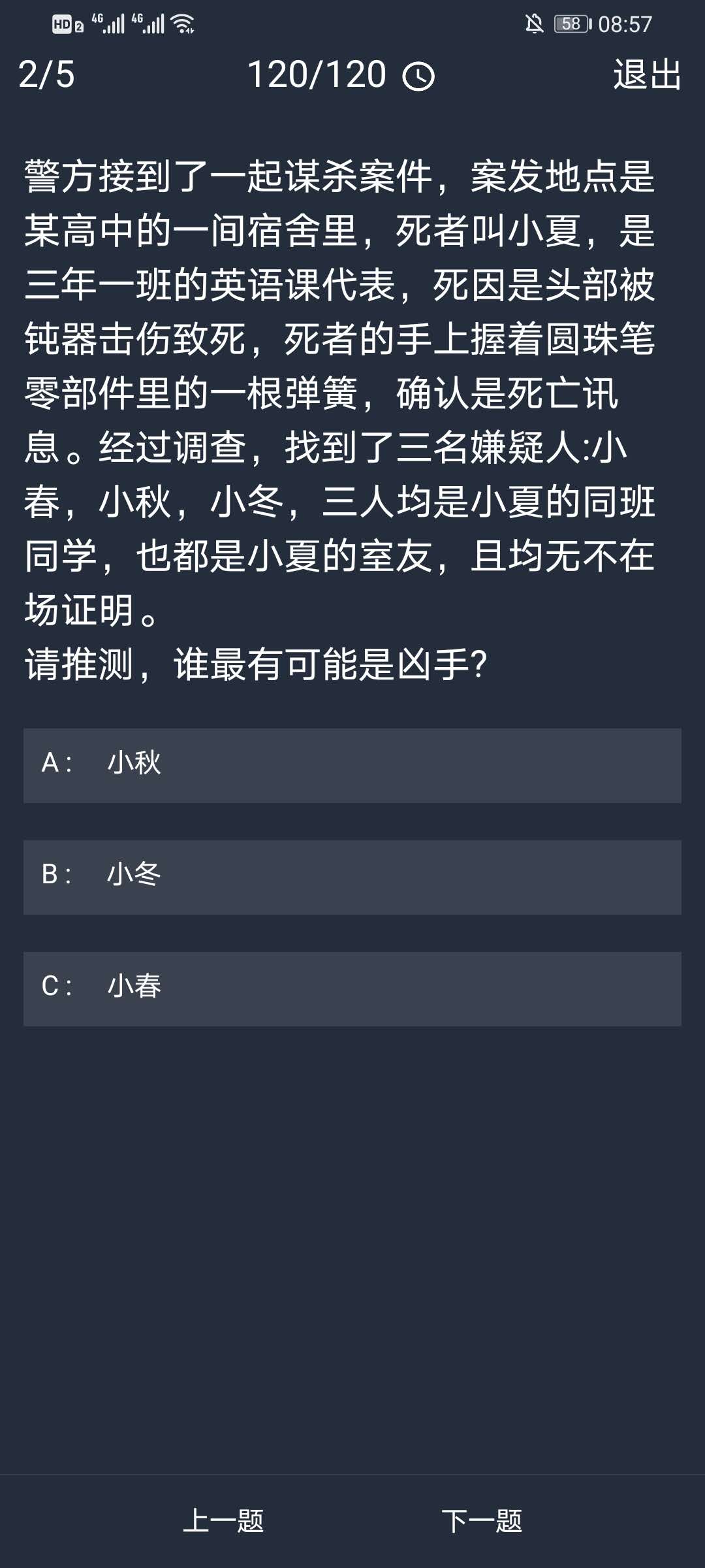2、警方接到了一起谋杀案件,案发地点是某高中的一间宿舍里,死者叫小夏,是三年一班的英语课代表,死因是头部被钝器击伤致死,死者的手上握着圆珠笔零部件里的一根弹簧,确认是死亡讯息。经过调查,找到了三名嫌疑人:小春,小秋,小冬,三人均是小夏的同班同学,也都是小夏的室友,且均无不在场证明。请推测,谁最有可能是凶手?