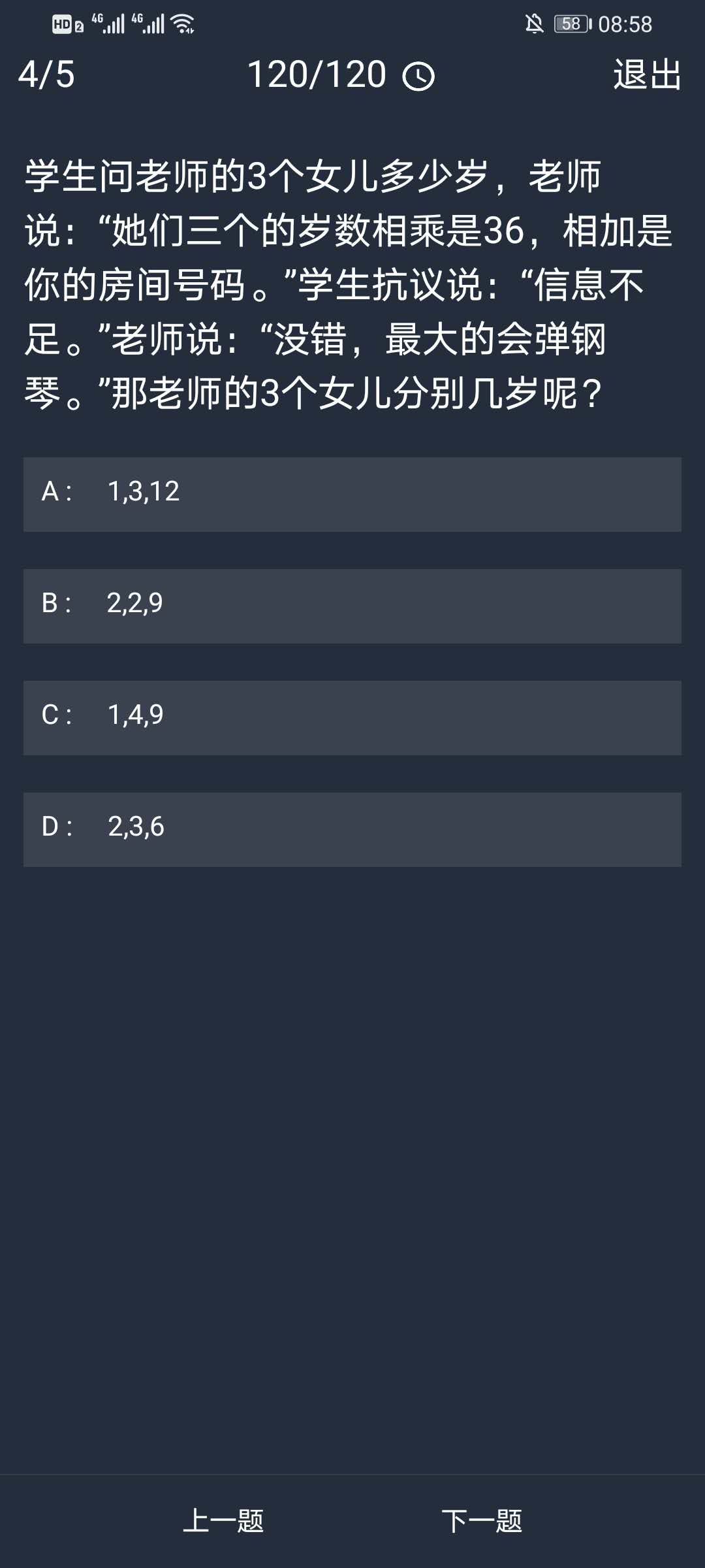 答案解析:积等于36,那么有1*1*36=36,1*2*18=36,1*3*12=36,1*4*9=36,1*6*6=36,2*2*9=36,2*3*6=36,3*3*4=36这几种情况。再来看相加1 1 36=38,1 2 18=21,1 3 12=16,1 4 9=14,1 6 6=132 2 9=13,2 3 6=11,3 3 4=10。如果学生的房间号是13号以外的数字,那么学生就能直接确定,不会说条件不足。所以学生的房间应是13号,而和为13的有两条,166,和229。最大的会弹钢琴,即只有一个会弹钢琴,那么就是2岁2岁9岁的组合。