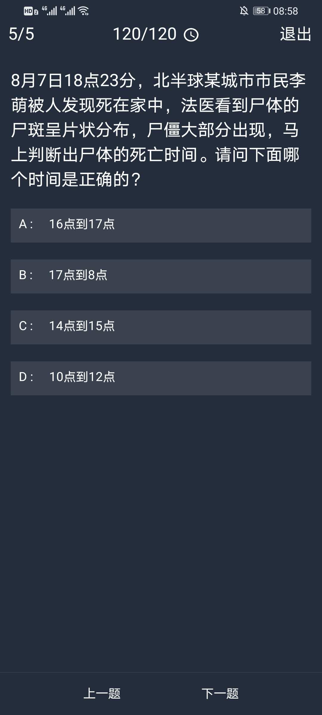 5、8月7日18点23分,北半球某城市市民李萌被人发现死在家中,法医看到尸体的尸斑呈片状分布,尸僵大部分出现,马上判断出尸体的死亡时间。请问下面哪个时间是正确的?