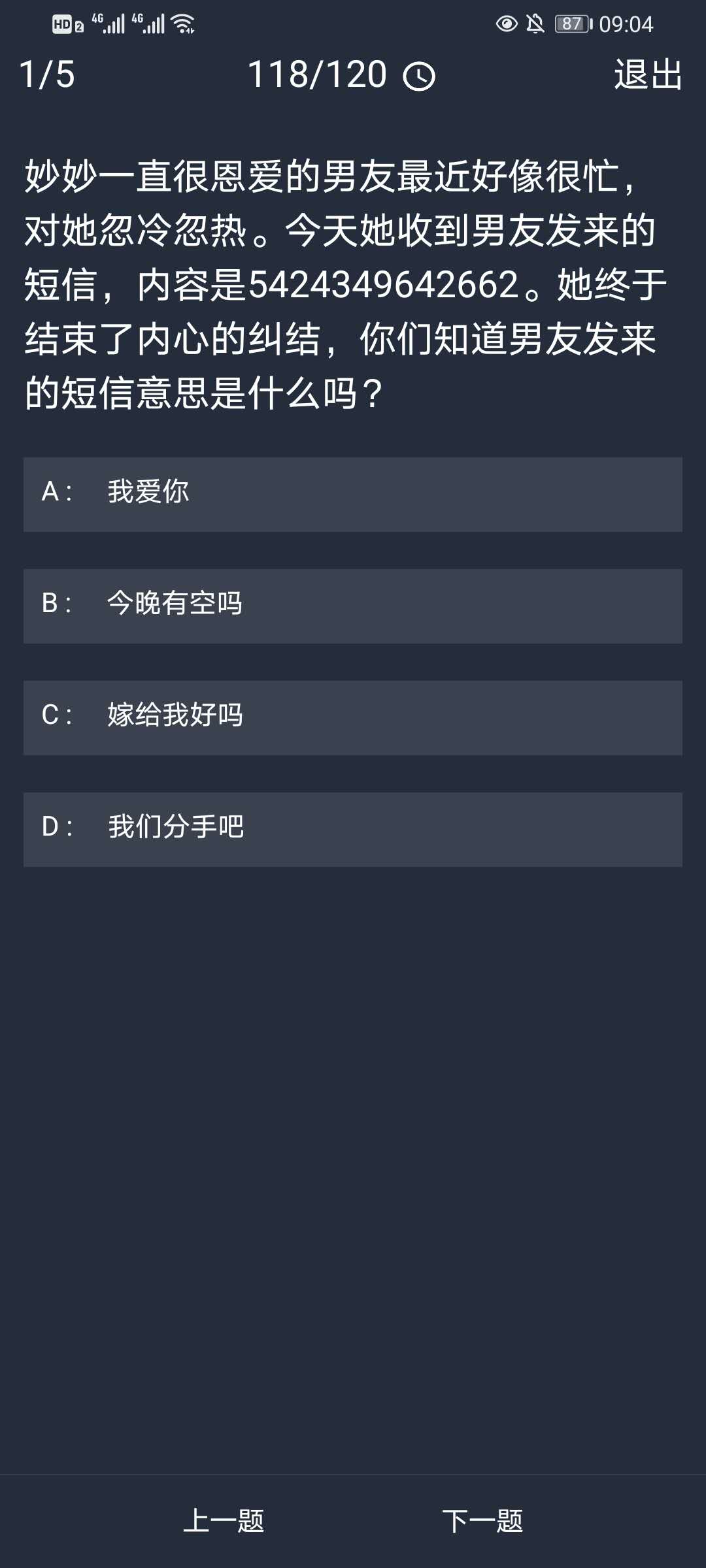 1、妙妙一直很恩爱的男友最近好像很忙,对她忽冷忽热。今天她收到男友发来的短信,内容是5424349642662。她终于结束了内心的纠结,你们知道男友发来的短信意思是什么吗?