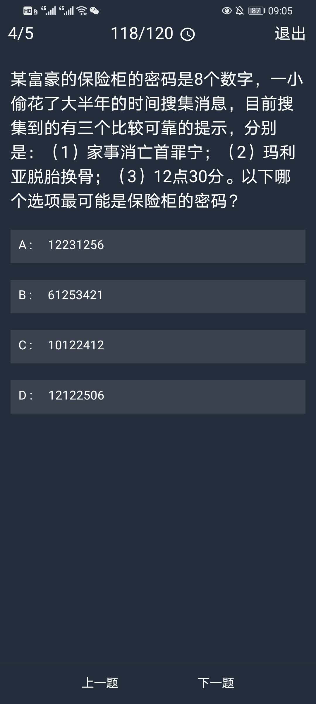答案解析:“家事消亡首罪宁”,说的是《红楼梦》里的秦可卿,而她在金陵十二钗排第十二名,所以是12。玛利亚脱胎换骨是指耶稣诞生,最广为流传的耶稣生日是12.25。12点30分就是12点半,半个12=6考虑到是八位数所以为06。A选项最有可能是保险柜的密码。